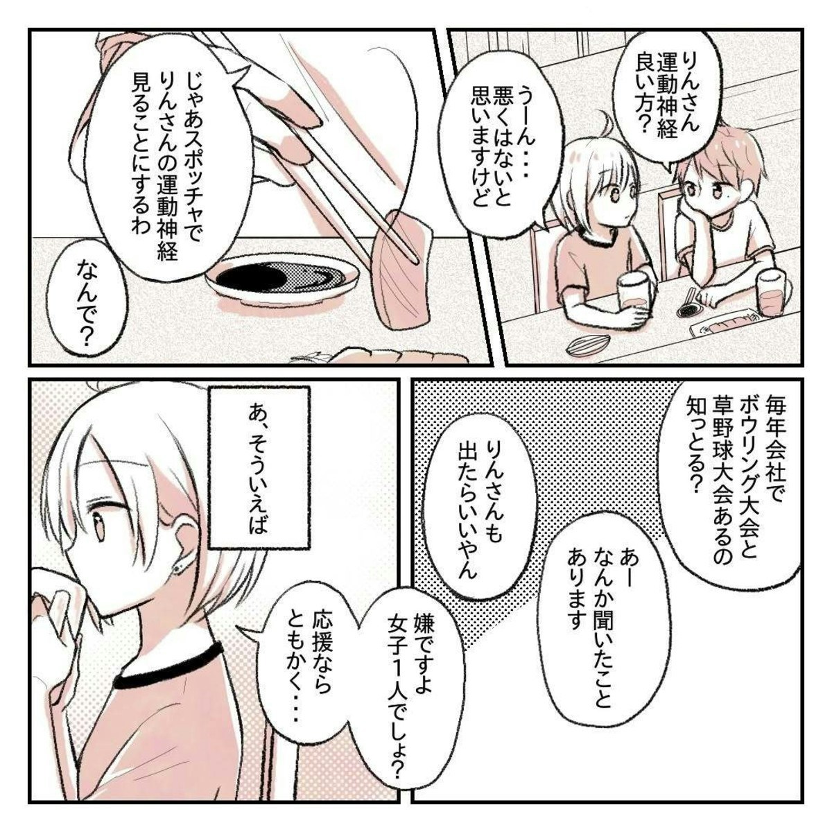 ゆーさんは、ボーリングが上手かったりんさんを思い出し、会社の大会に出場したらどうかと言いました。しかし、りんさんはそんな気持ちはあまりない様子です。