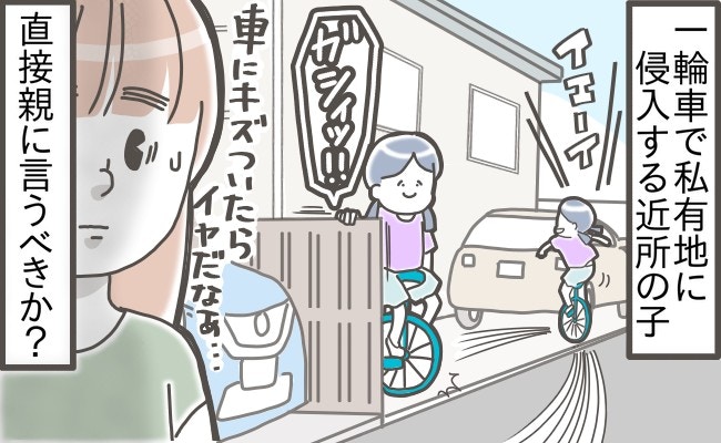 お隣さんや角の家の駐車場に一輪車で入ったりしているのを何度も見ており、うちは車もあるし、所有地に立ち入られるのイヤだなーくらいに一カ月程前から思っていました。
