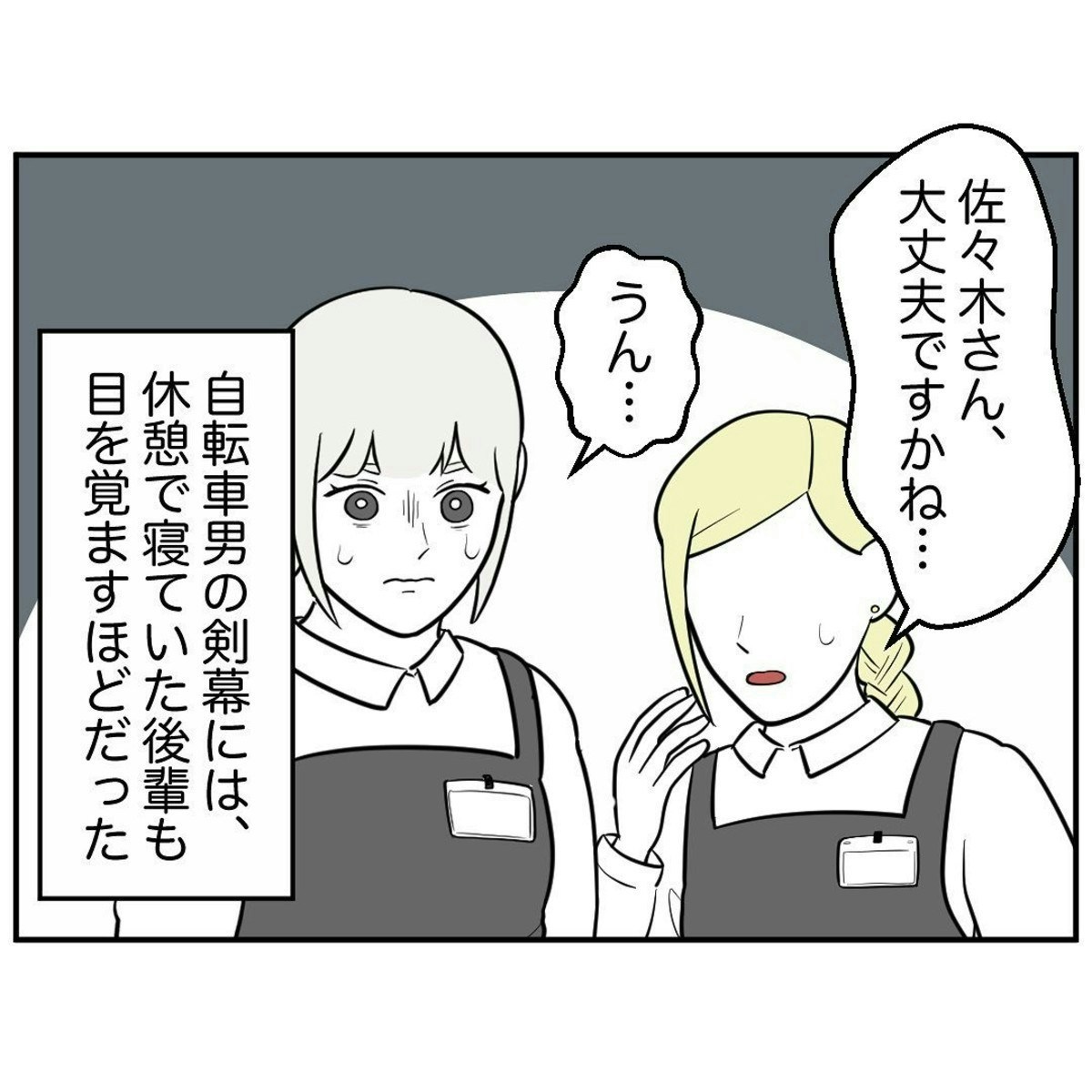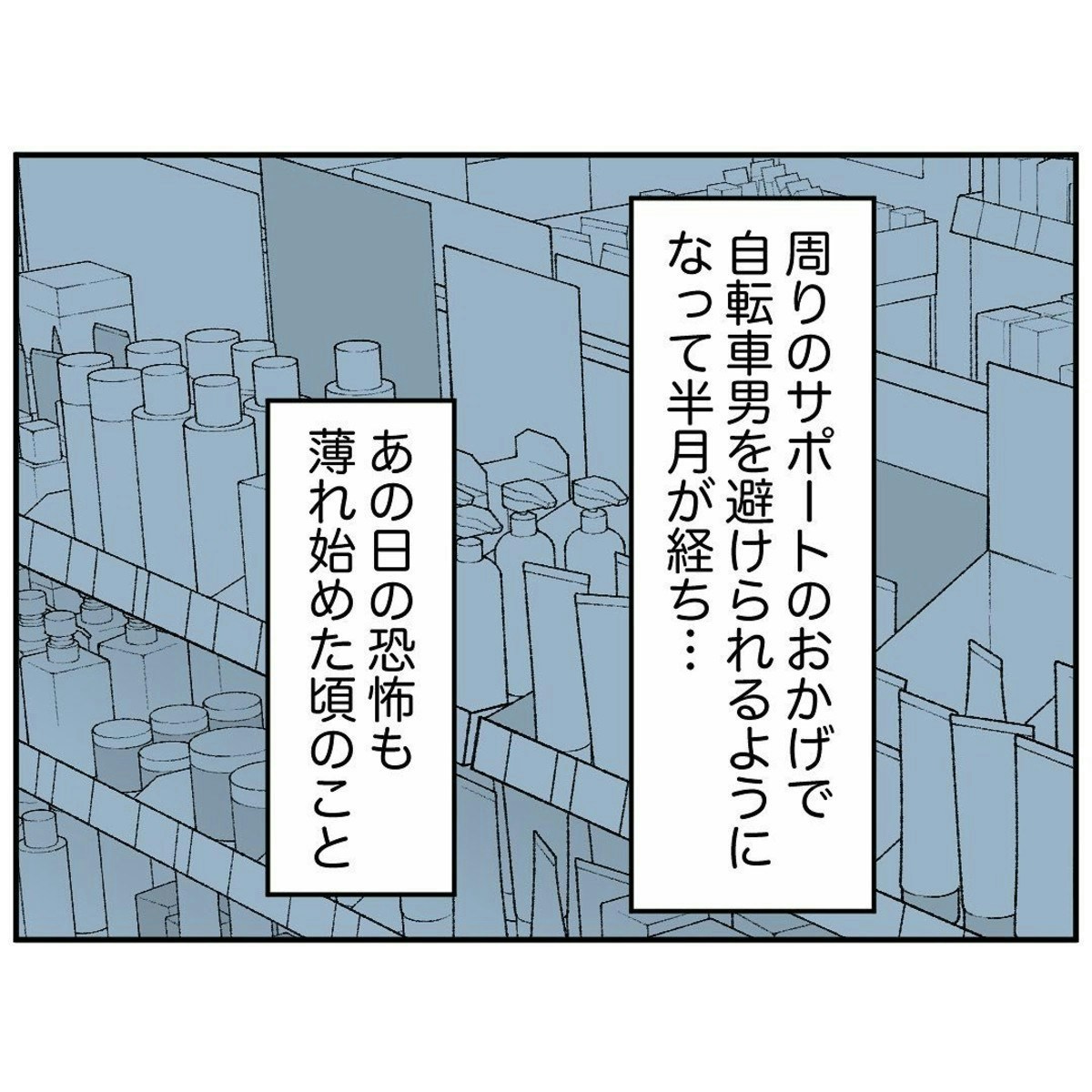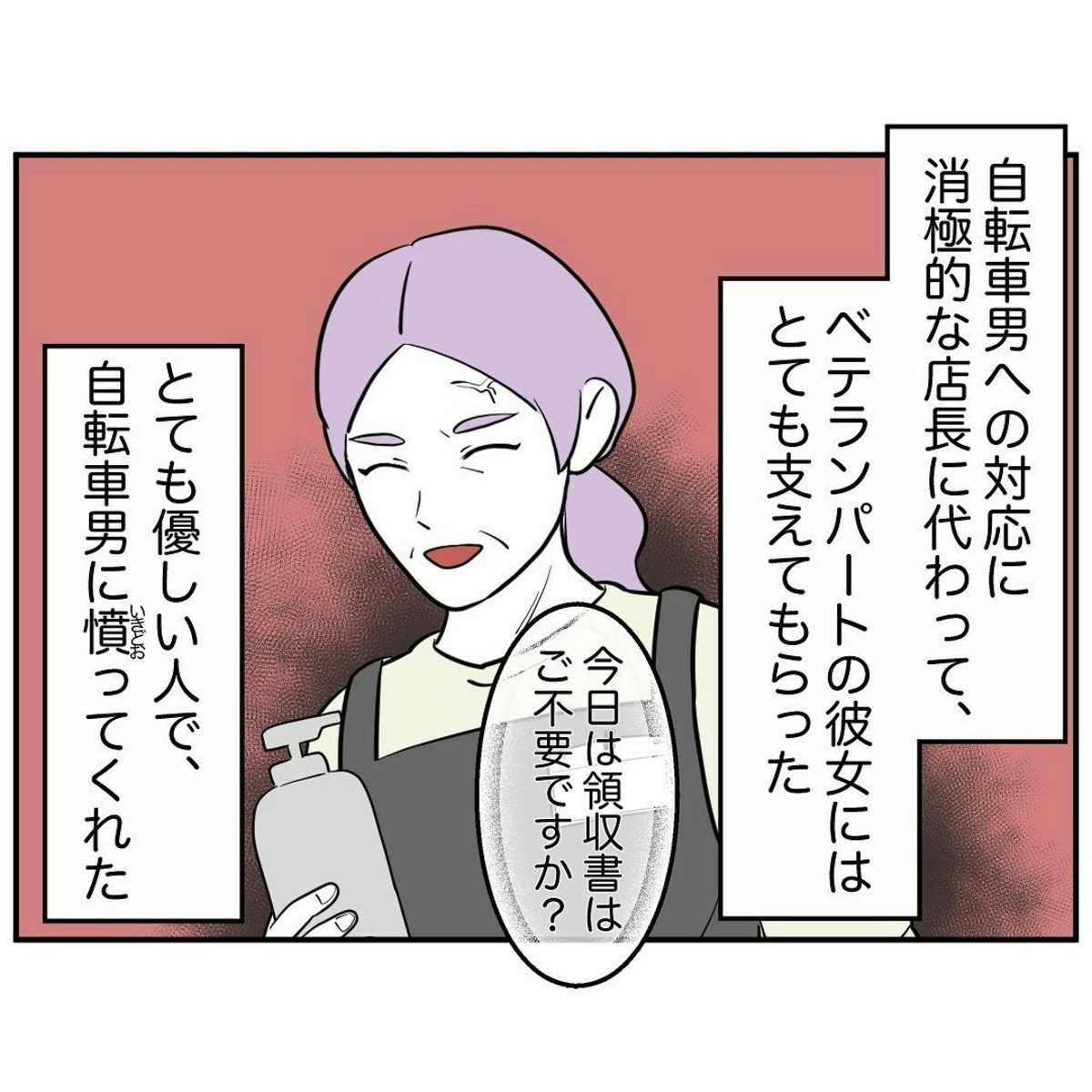 自転車で来店しては、ほや助さんの応対するレジに並び、どんなに少額の買い物でも手書きで領収書を書かせるその男性客について、バイト店員たちは「自転車男」と呼んでやり過ごしていました。ただ、少しずつ自転車男の行動はエスカレートしていき、自転車置き場からずっとほや助さんを見つめていたり、1人で倉庫の片づけをしていたほや助さんを追いかけたりするように…。