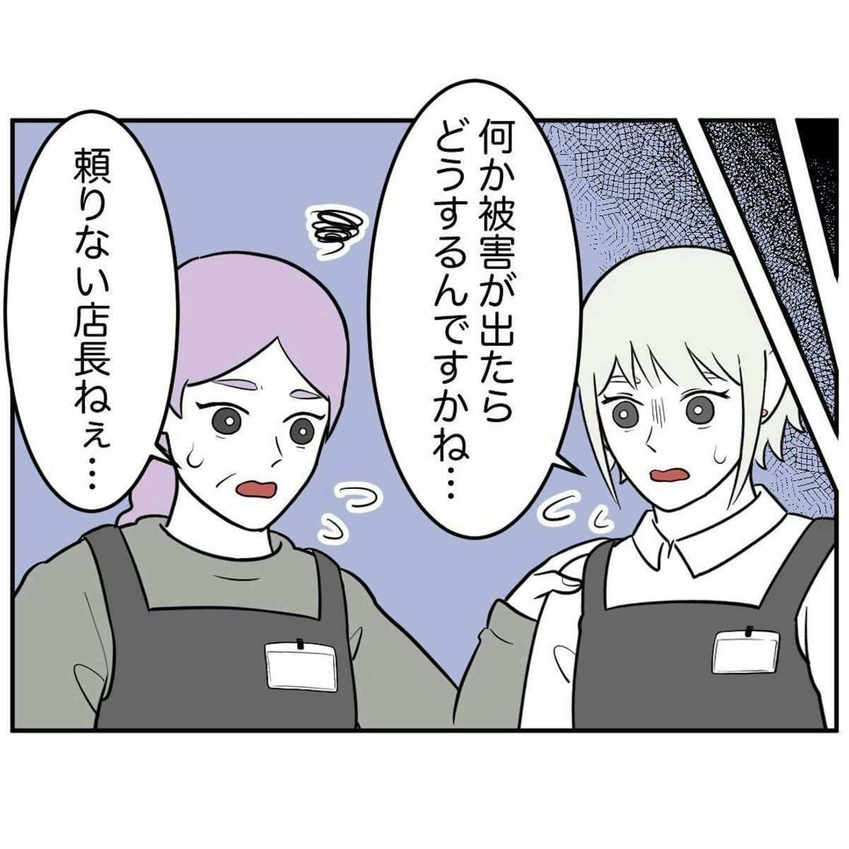 年配のパート職員さんや店長より年上の社員さんがほや助さんをガードしてくれたおかげで実害は出ていませんが、それでもこのままではほや助さんは危険な目に遭うのでは…とゾッとしますね。職場を離れたくない場合、勝手に通報するのは難しいのかもしれませんが、バイト先より命です。危険を感じたらしっかり適切な機関に相談することは大事ですね。