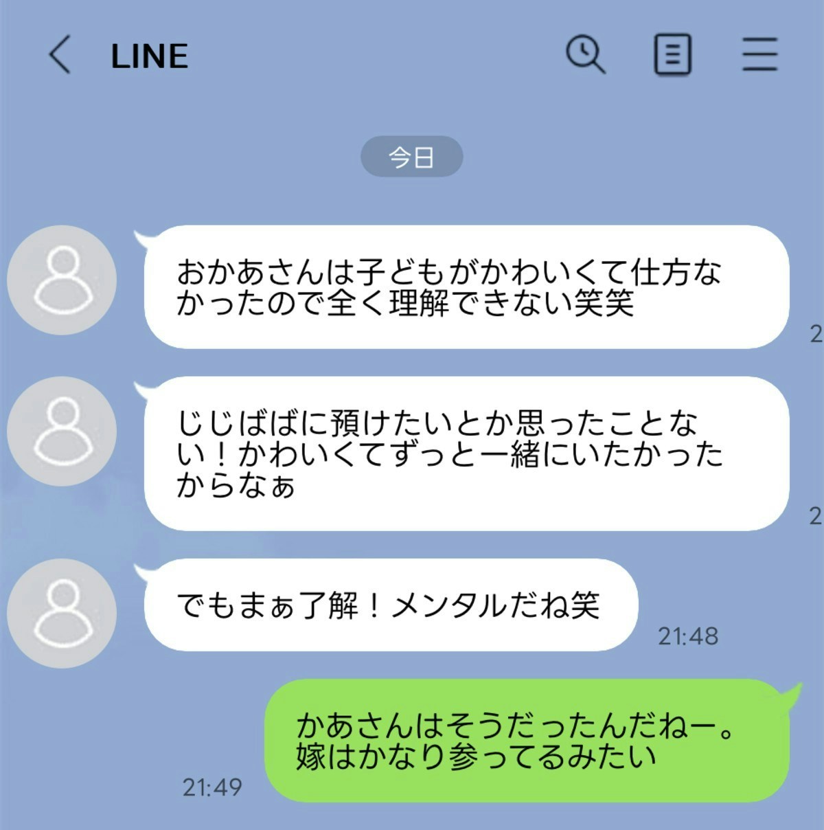 そもそもママが育児で疲れ果ててるのは旦那かつ父親である貴方の力不足であり、それを他人事のように「疲れてるみたいだから〜」と義母に愚痴ラインのスクショを送る‥読んでいて他人でも腹立ちます😂