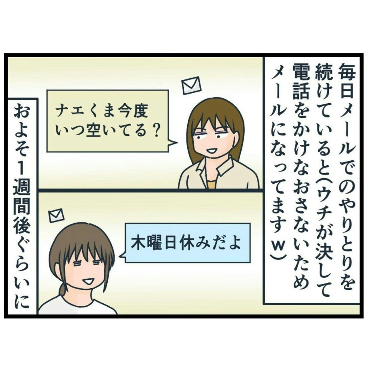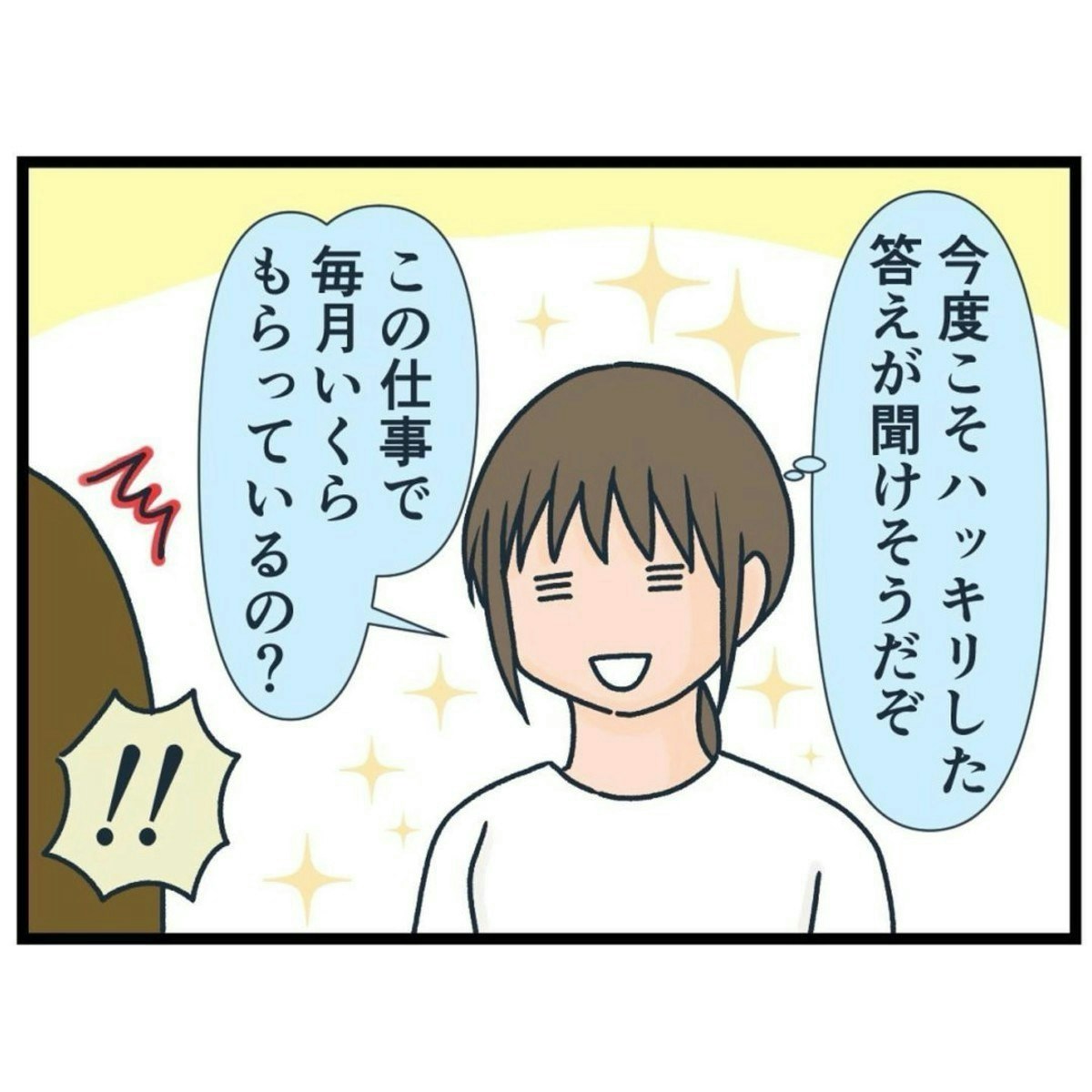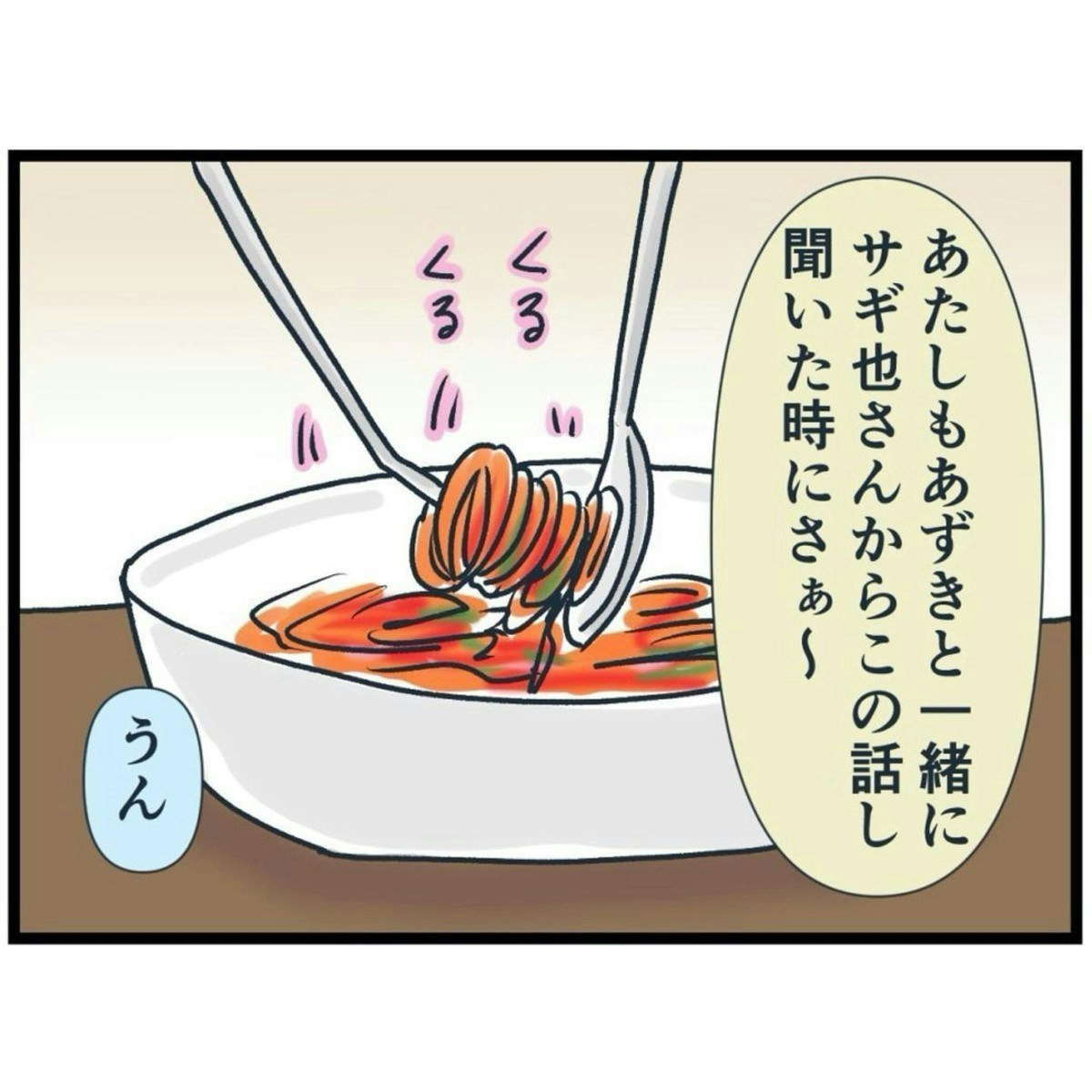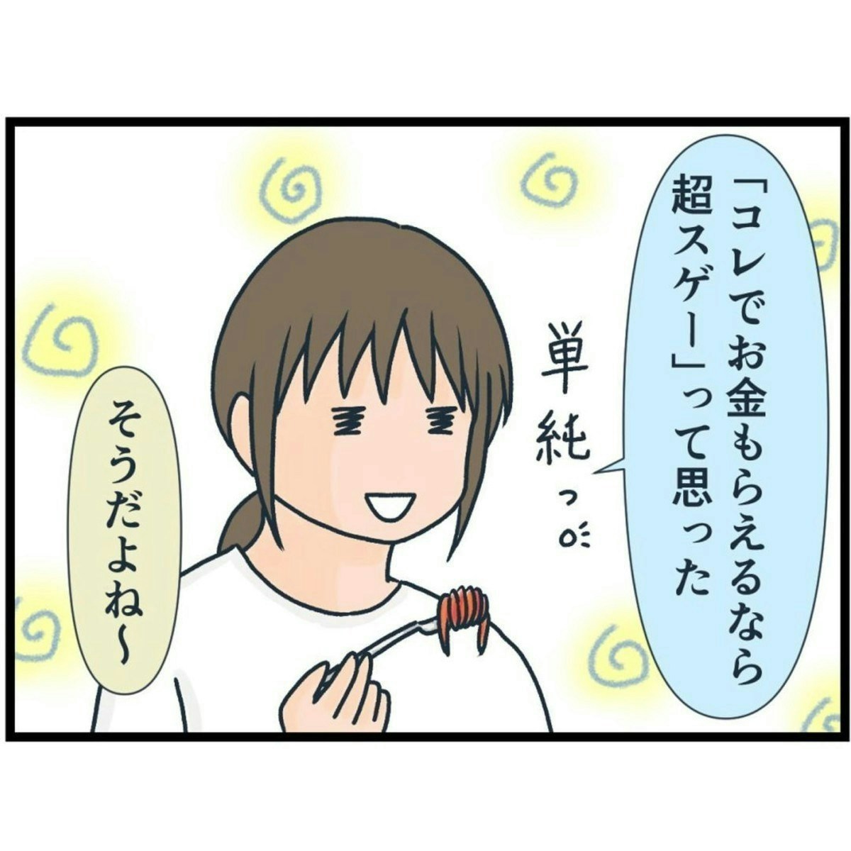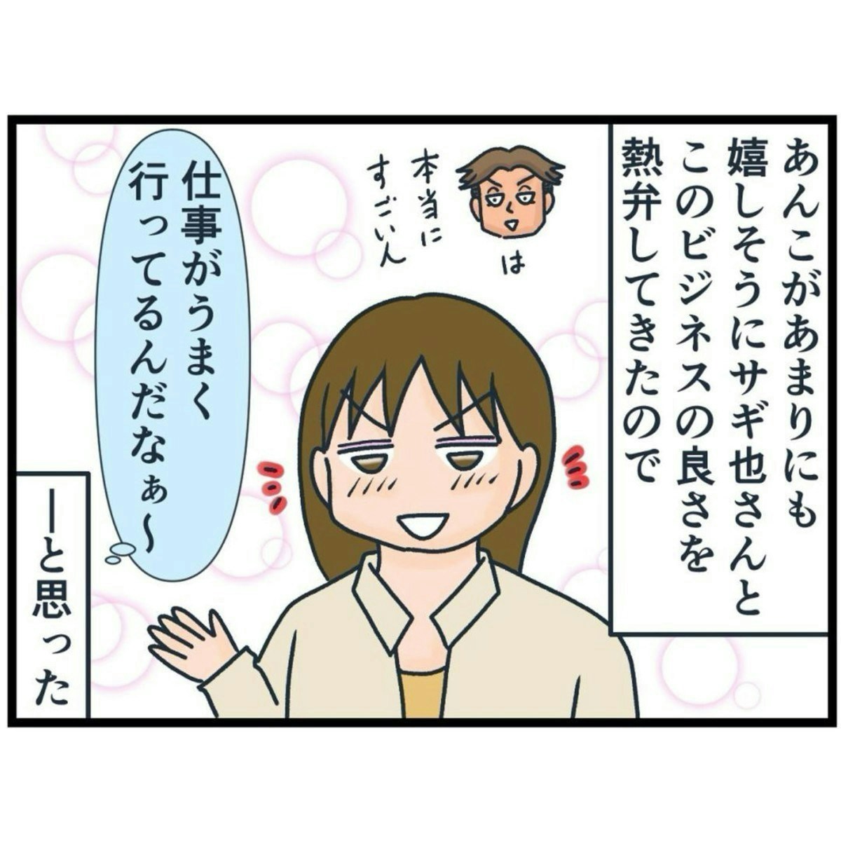 約束の日には、あずきとその友人・あんこ、そしてあずきとあんこが尊敬する・サギ也という人が同席しました。サギ也はあずきとあんこの上司に当たる人で、一緒に入ったファミレスで「調子のいいバイト」の説明がされます。所々、怪しいと思う点があったものの、「あずきの紹介する話だから大丈夫」と思ったナエくまさんは、そのバイトに登録します。