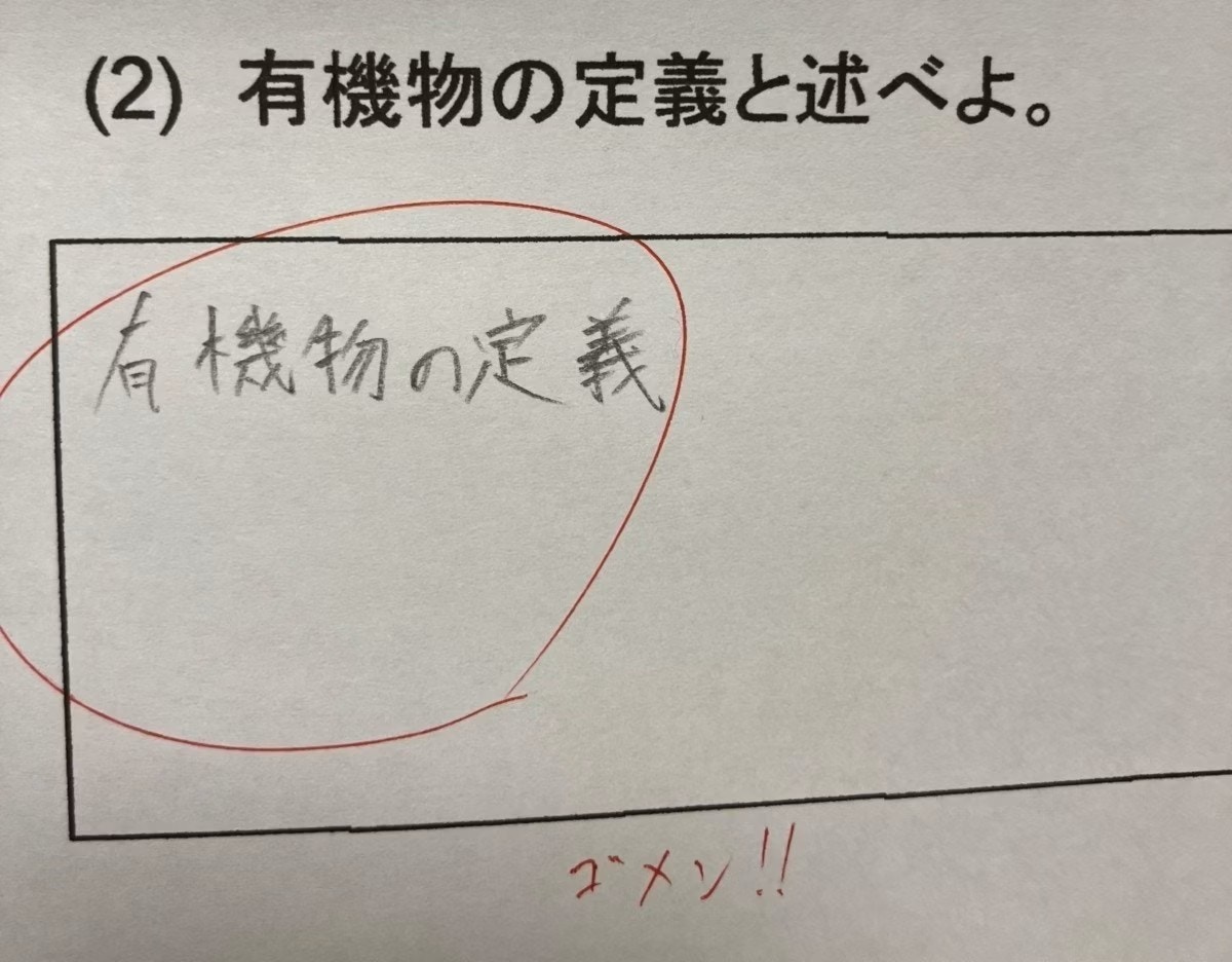 有機物の定義「と」述べよ、と書かれているため、そのまま解答欄に「有機物の定義」と書いたあんせんとさん。先生としては、有機物の定義「を」述べよ、と書くつもりだったのですね。