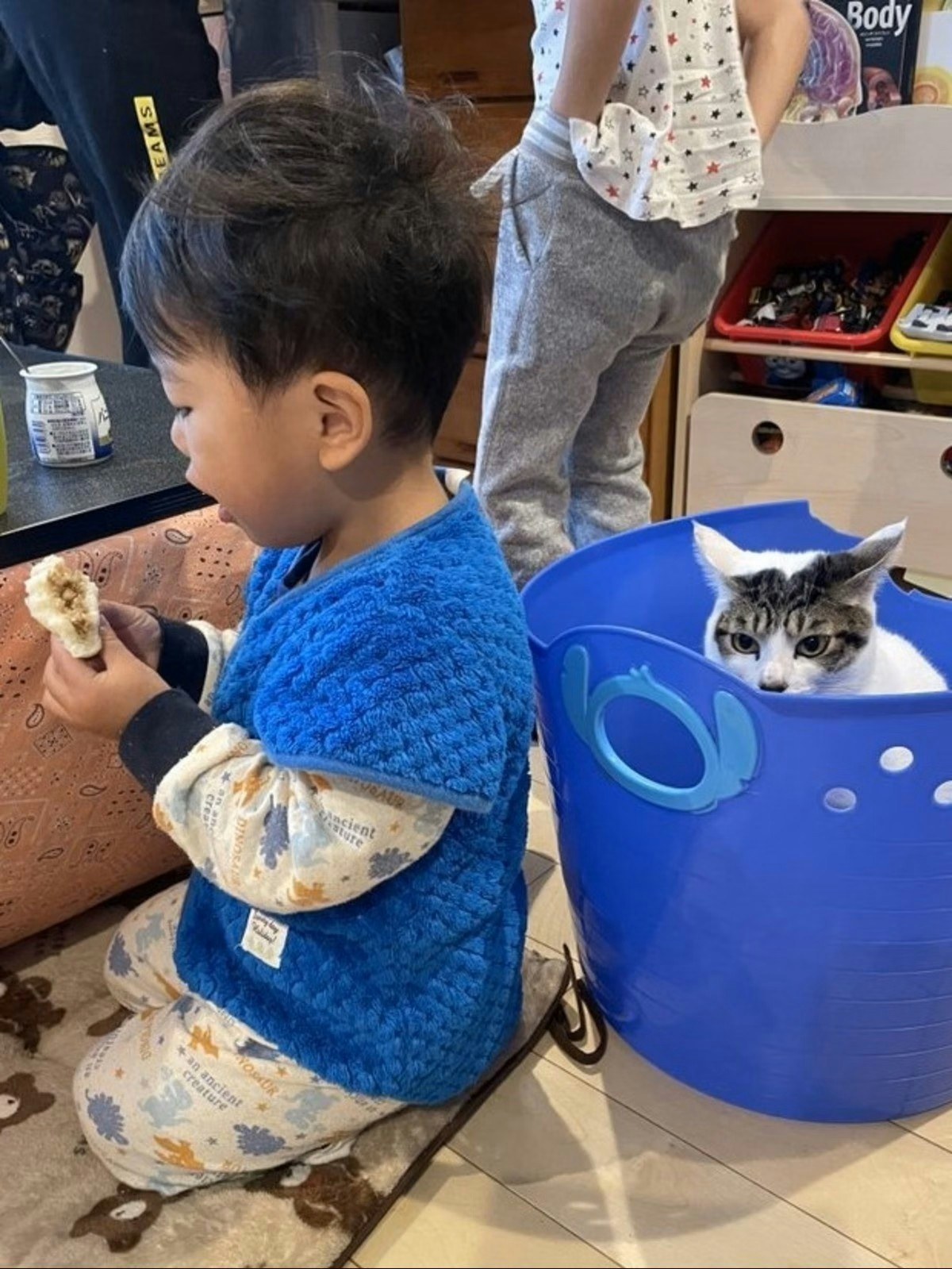 正座をして肉まんをジッと見つめる姿がかわいい写真。初めて食べる肉まんのおいしさに感動した様子が、表情からひしひしと伝わってきます。もっといっぱい食べたいという願望が「10個」という数になったのでしょうね。