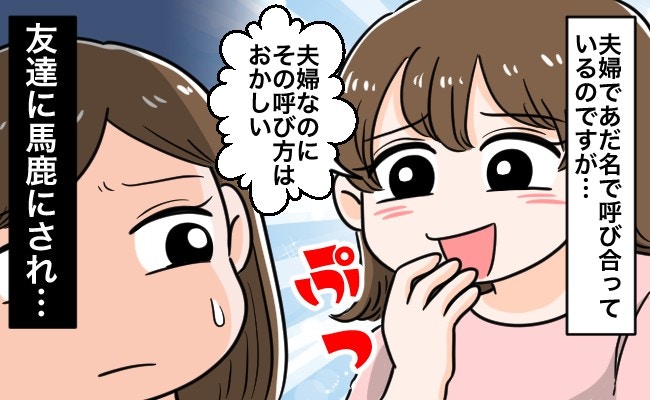 夫を恋人時代から名字をもじったあだ名で呼ぶ、投稿者さん。結婚後も呼び方を変えるタイミングがなく、夫ともこのままでいいよねと話していました。しかし友人からは「夫婦なのにその呼び方はおかしい」と批判的な意見が。会うたびに指摘してくるため、投稿者さんも嫌な気持ちになっているそうです。