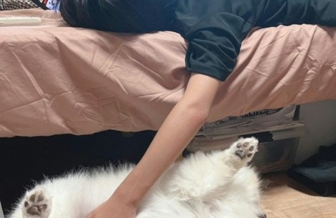 お子さんはベッドに寝転がり寛ぎながらも、片手でモフモフを堪能している様子。なんとも羨ましい…!愛犬のちくわちゃんもバンザイをしてリラックスモードですね。