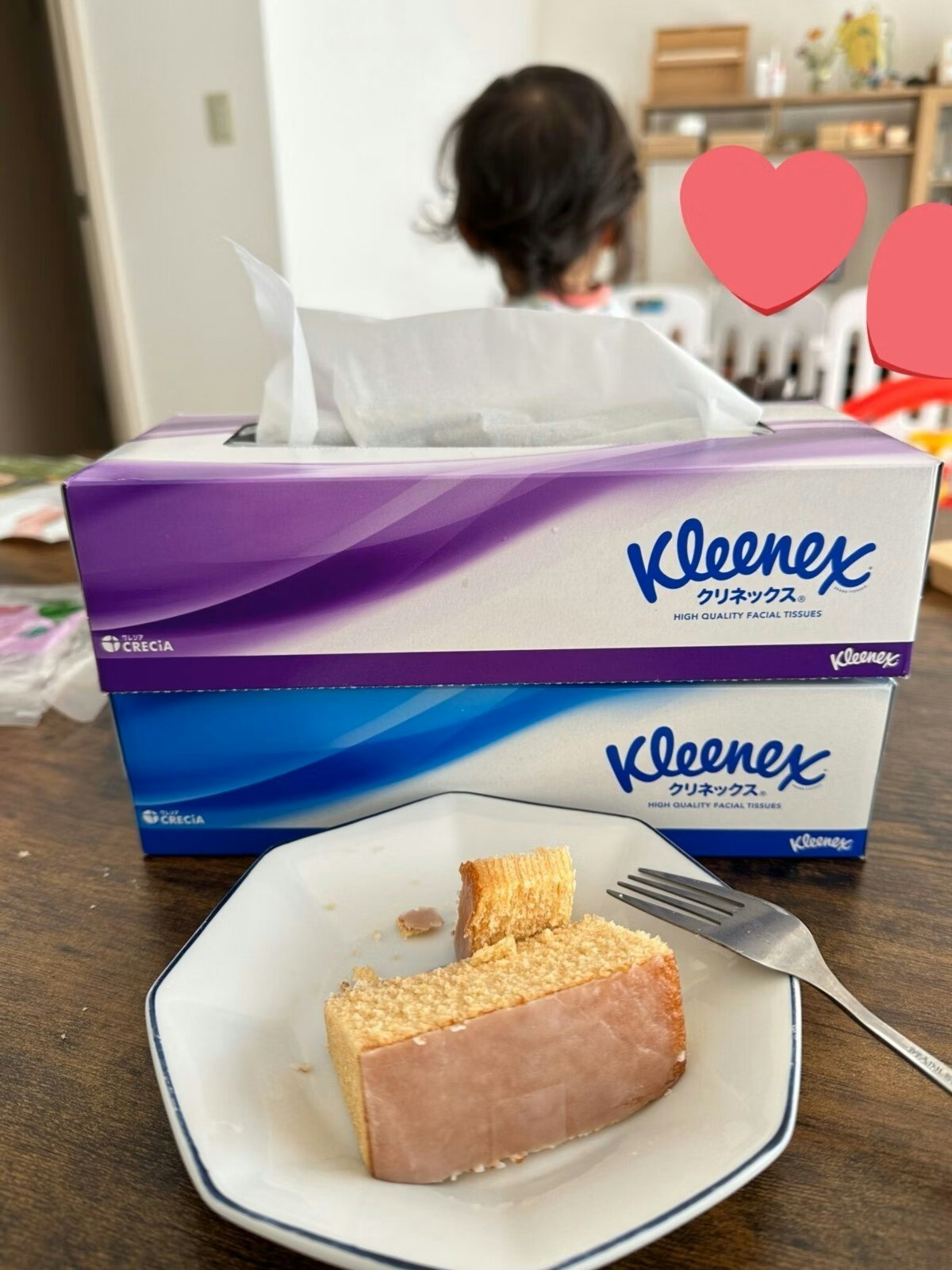 すぐ目の前にお子さんがいる中、箱ティッシュを重ねて壁を作り、おいしそうなバウムクーヘンを食べている、くるるさん。おやつタイムを子どもに見つかると「食べたい!」と言い出しますし、大人向けのおやつは親が独り占めしたいこともありますよね。くるるさんにとって、この壁はとても大事な役割を果たしているようです。