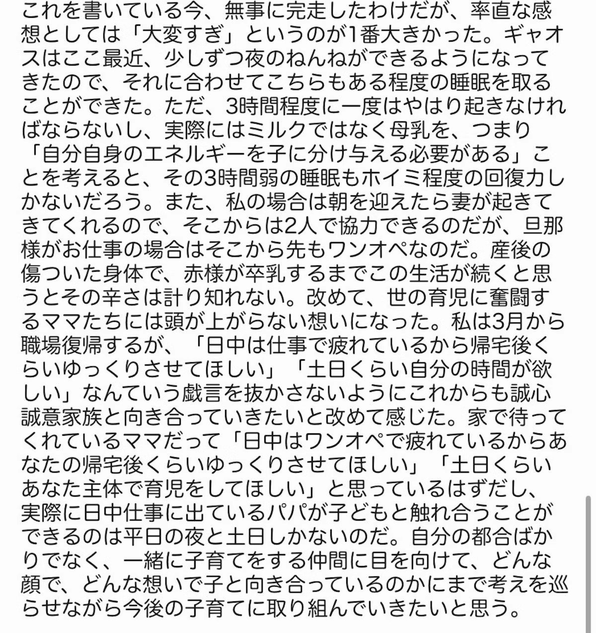 とても読みやすく、またユニークな表現で書かれた「夜勤完走」への育児日記は、父・母関係なく、育児に関わる人や周囲に子どもを育てる人がいるたくさんの人に届けばいいなと思える内容でした。