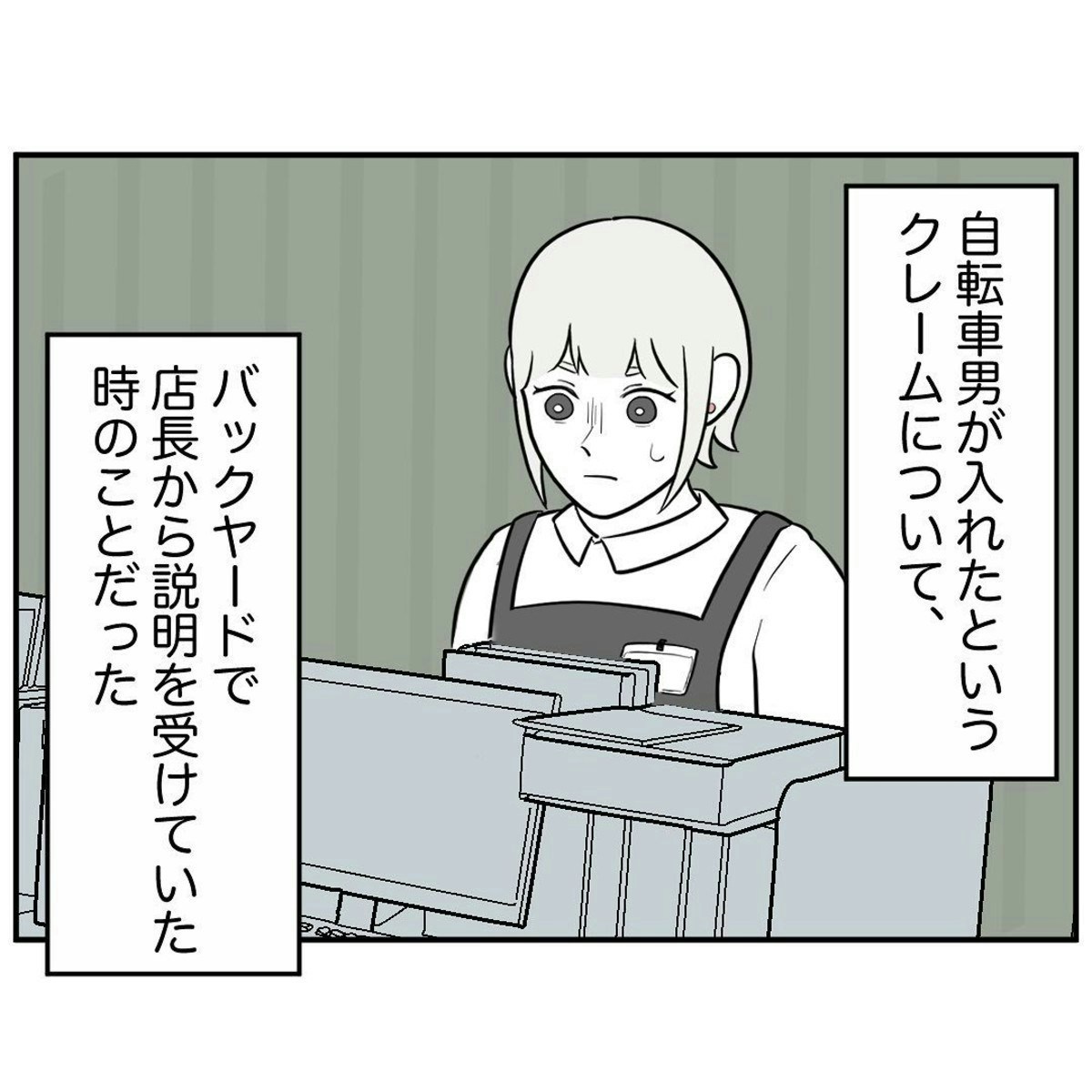 彼はいつもほや助さんの接客を名指しして希望し、どんなに少額の買い物でも手書きで領収書を書かせるのでした。そして、日を追うごとに彼はほや助さんに近づくようになり、とうとう佐々木さんというベテラン社員がほや助さんをかばった際、店内で大声をあげて怒りをぶちまけました。その後、自転車男は「佐々木という店員にほや助さんとの仲を邪魔された」と本社にクレームを入れたのですが…。