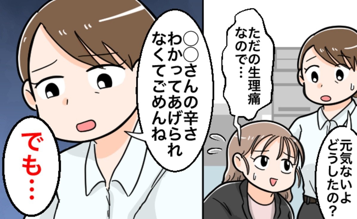 「生理痛は体が休みたいよ〜って言ってるサインだよ?私、生理痛軽いから〇〇さんの辛さ分かってあげられなくてごめんね💦でも人それぞれなのは理解してるし、自分を大切にしないと!今まで気付いてあげられなくて申し訳無いよ、ほんと。今日は休も休も!」と言ってくれました。