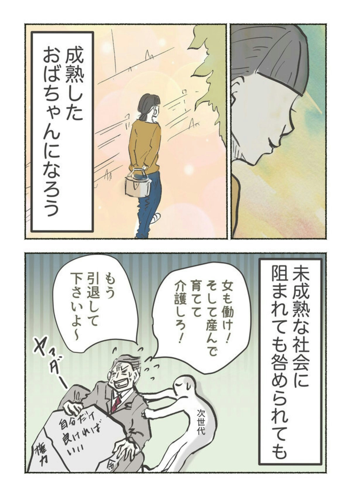 しかし、みかこやはるみは年齢や経験を重ねて生きてきた女性への尊敬の気持ちが込められるようになれば「おばちゃん」はある意味称号になるのでは?と考え始めています。はるみの友人が勢いよく話したように、自分の価値を決めるのは社会ではなく自分自身、と女性たちが胸を張って過ごせるようになれば、年齢にかかわらずイキイキと日々を生きられるようになるはず。
