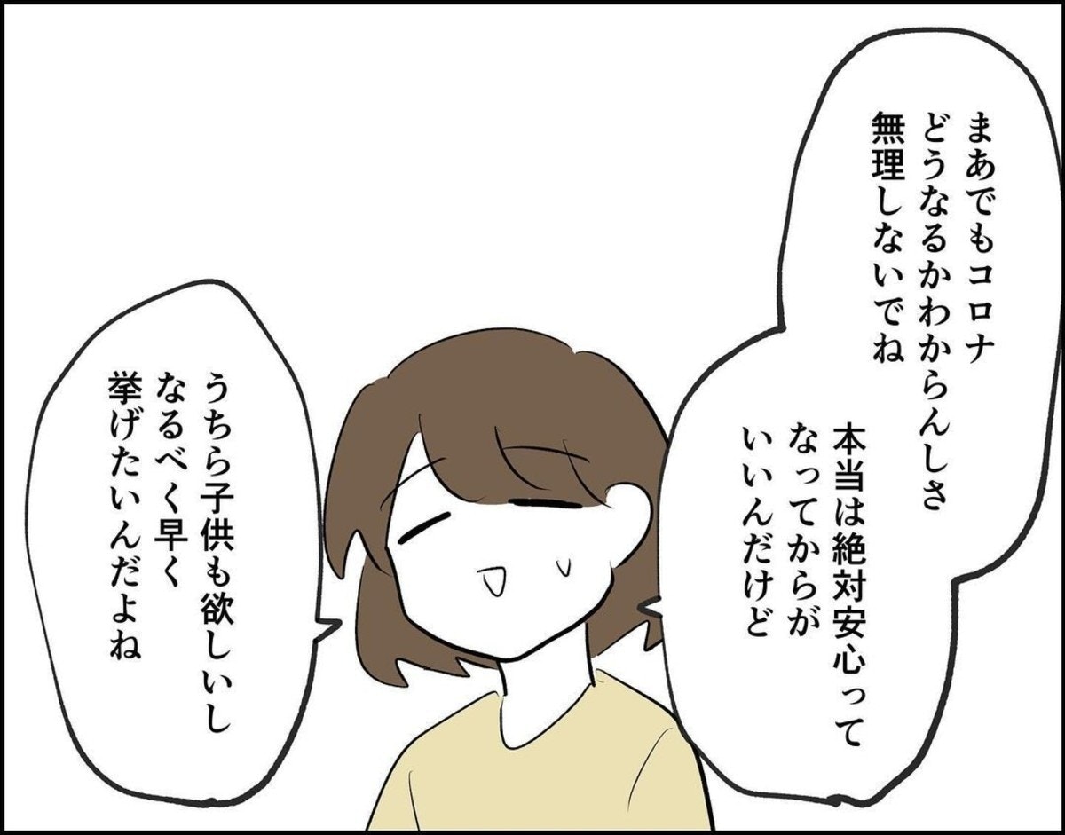 ただ、時はコロナ禍が気になるころ。盛大な結婚式や友人をたくさん呼んでの結婚式などが挙げづらい時期でした。それでも、今後のことを考えて、早めに式を挙げたかったセミは、結婚式について世羅・星佳に相談してみることに…。