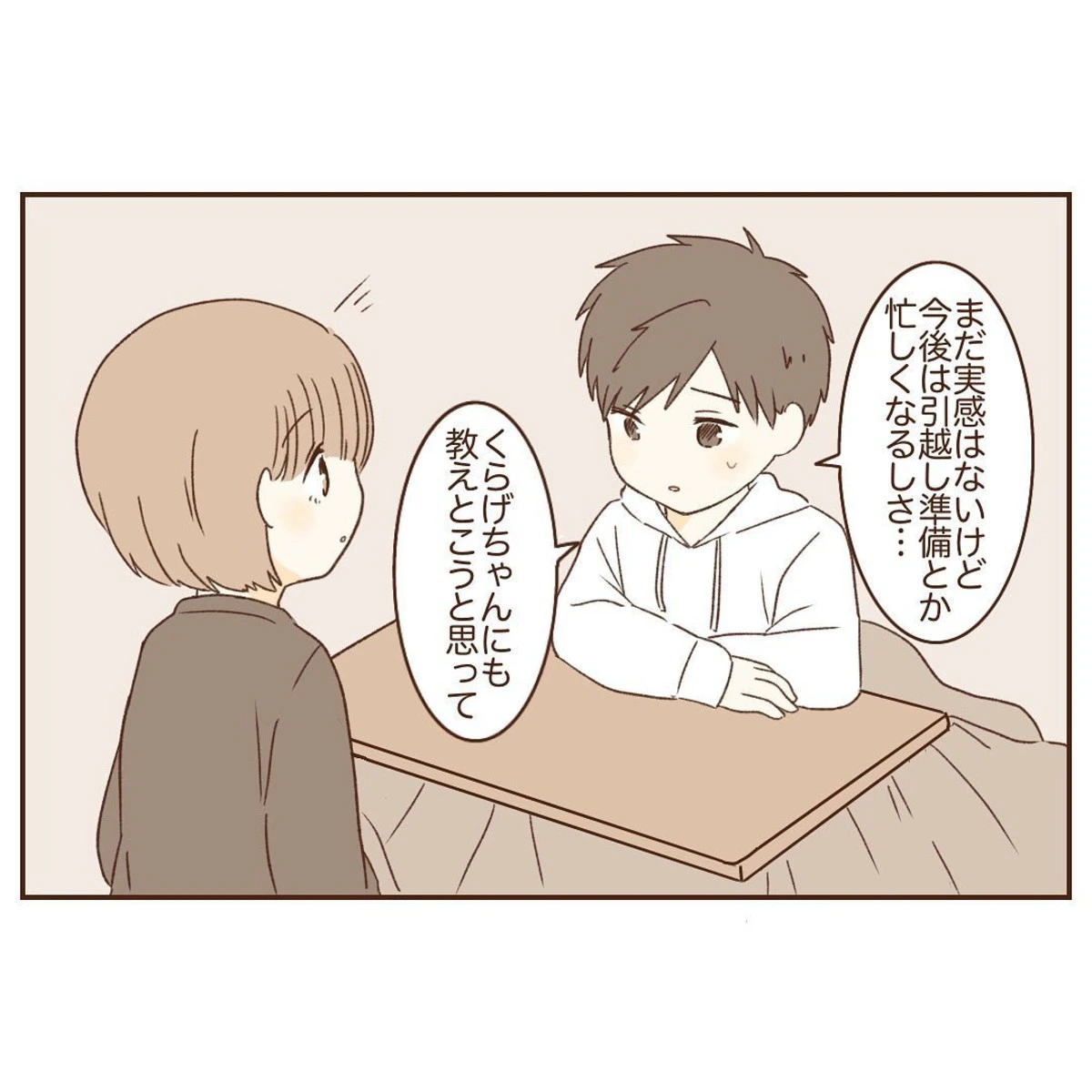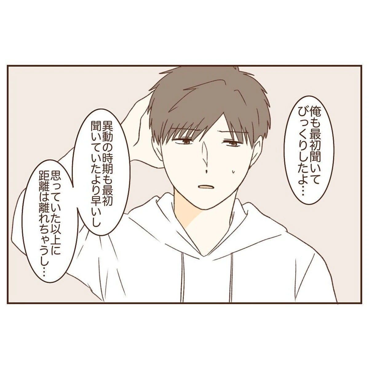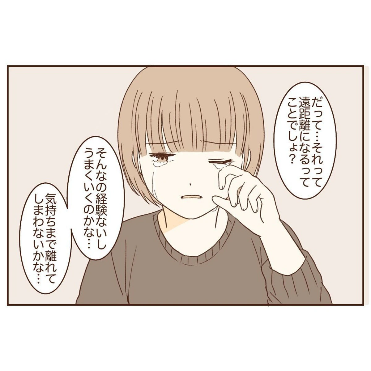 くらげさんは、みなとくんから転勤することになり、これまでのように頻繁に会えなくなると知らされました。くらげさんは遠距離恋愛の経験がなく、離れて過ごすことでお互いの気持ちまで離れてしまうのではないかと、とても不安に感じています。