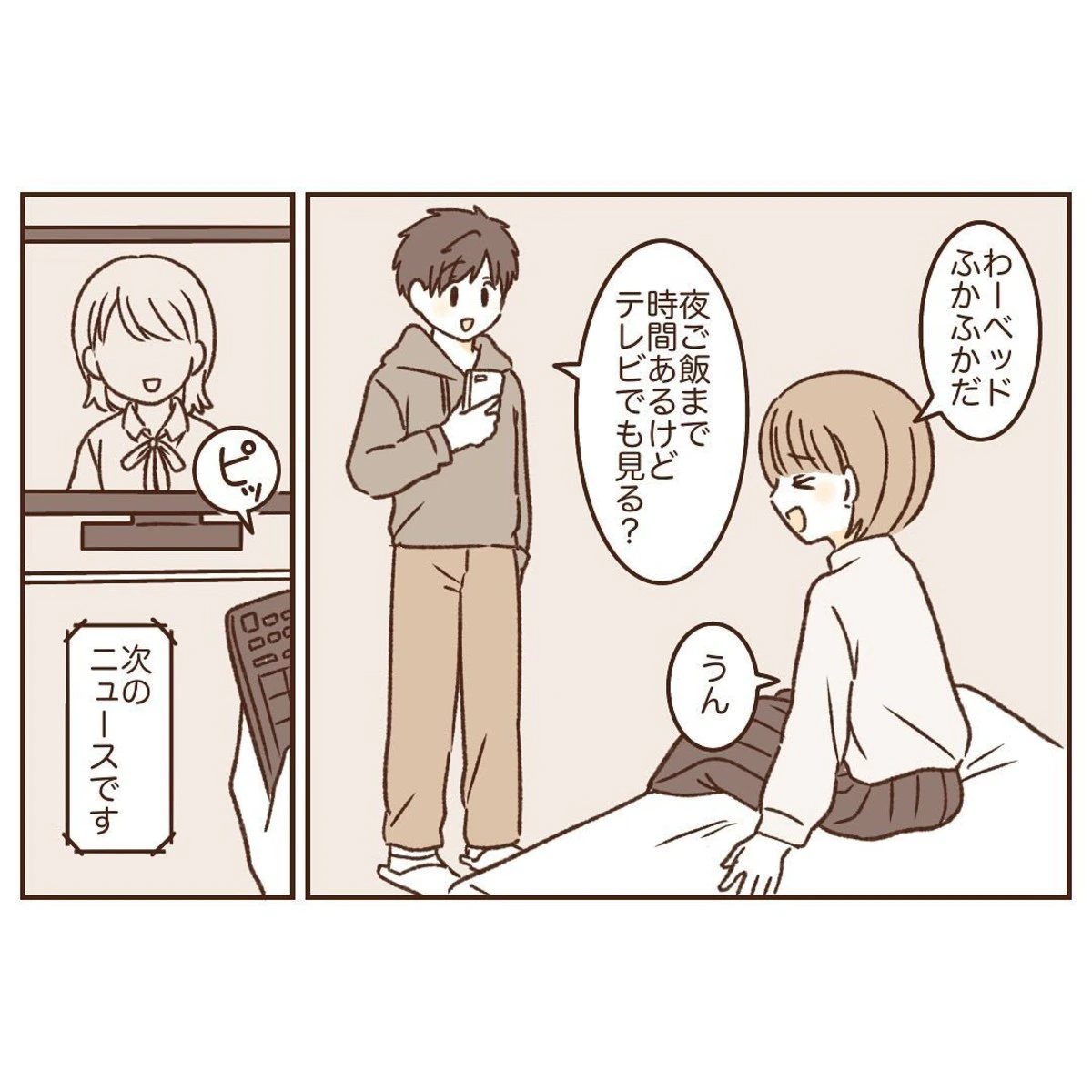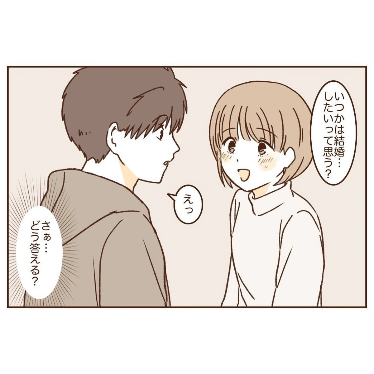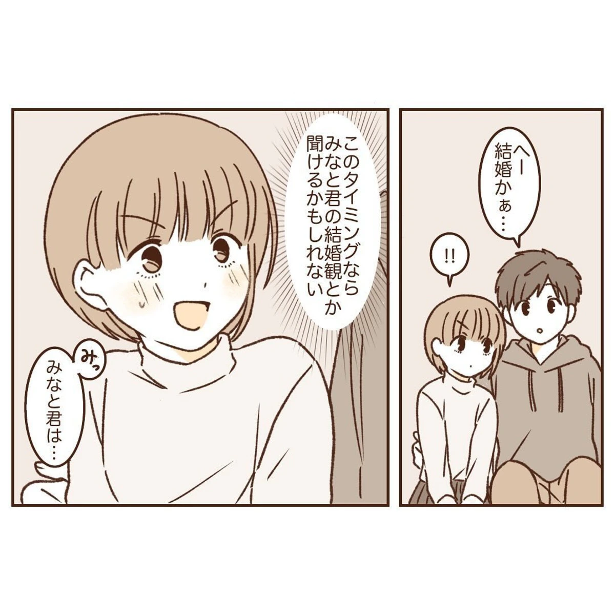 くらげさんは、旅行先のホテルのテレビで、芸能人カップルの結婚が報道されているのを見ました。このニュースをきっかけにし、くらげさんはみなとくんに結婚について率直に質問してみました。