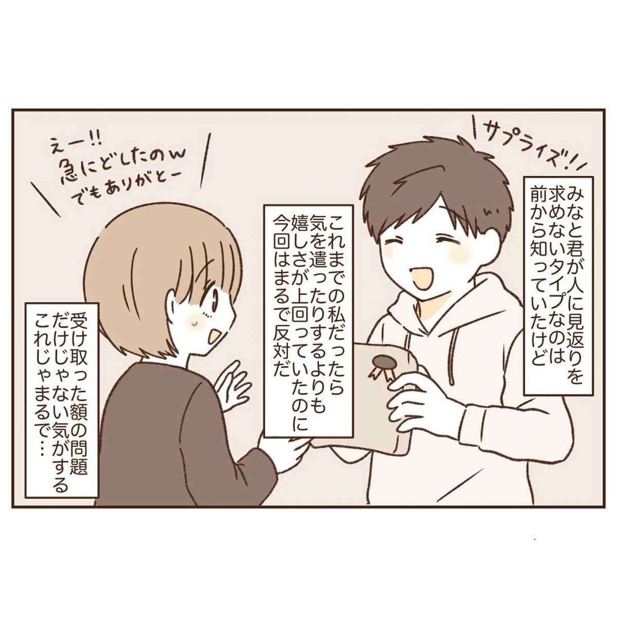 今回の旅行では、みなとくんからプレゼントをもらったとき、素直に喜ぶことができず、むしろ負担に感じてしまった自分に気づき、くらげさんは戸惑ってしまいます。
