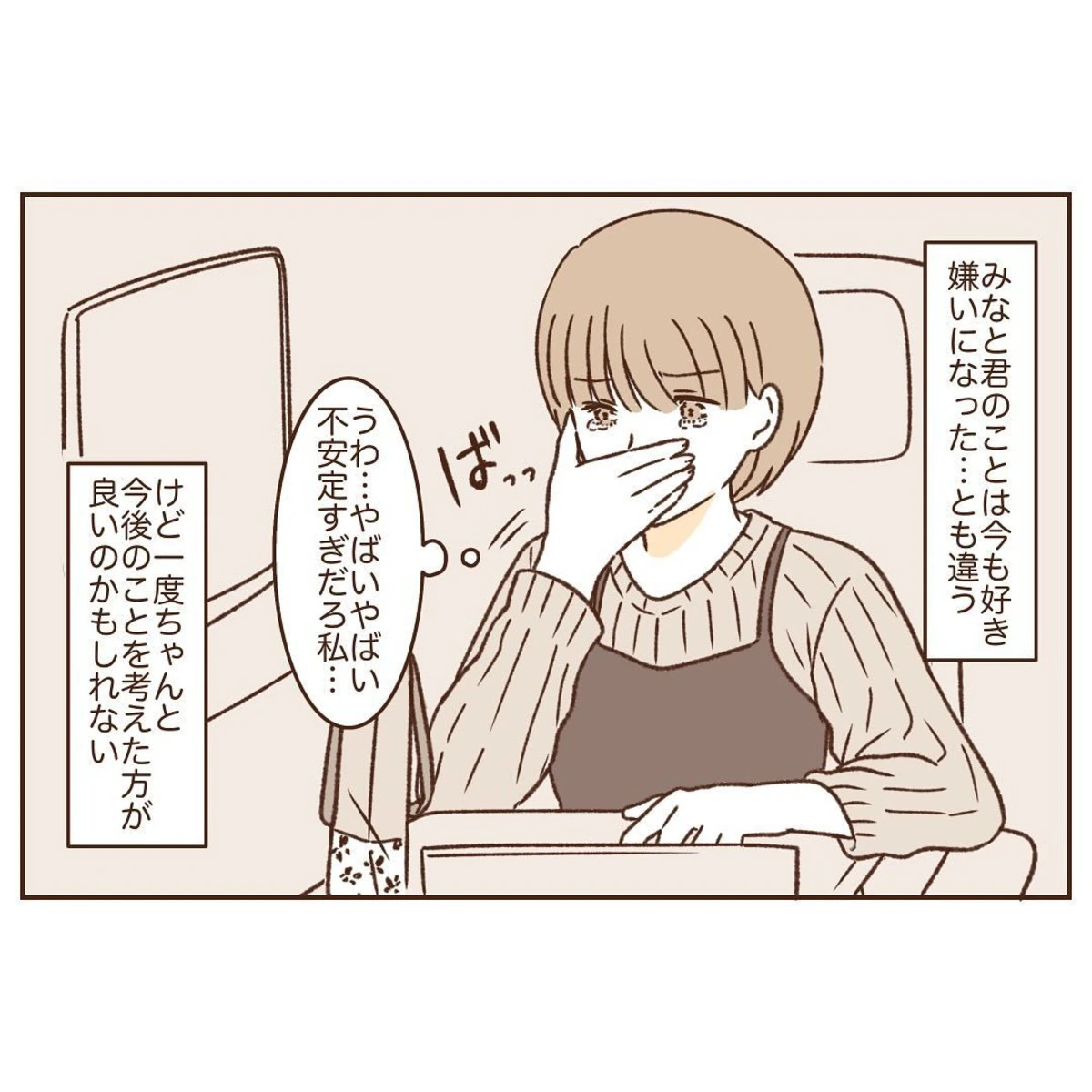 くらげさんとみなとくんは、2泊3日の旅行を終えました。帰りの電車の中で、くらげさんは自分の中でみなとくんに対する気持ちが変わり始めていることに気づきます。その変化に戸惑い、これからどうしたらよいのかわからなくなり、思わず号泣してしまいました。