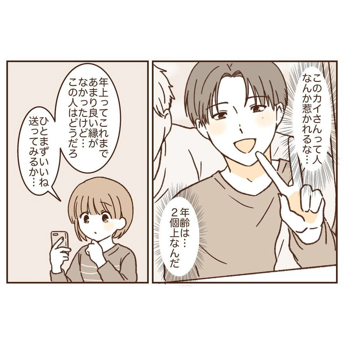 くらげさんはマッチングアプリを利用して、何人かの男性とデートをしました。しかし、初対面のときにどうやって距離感を取ればよいのか悩み、なかなか「この人だ」と思える男性には出会えませんでした。そんなある日、2歳年上のカイさんに心惹かれました。