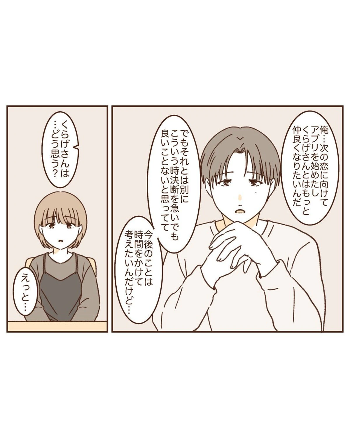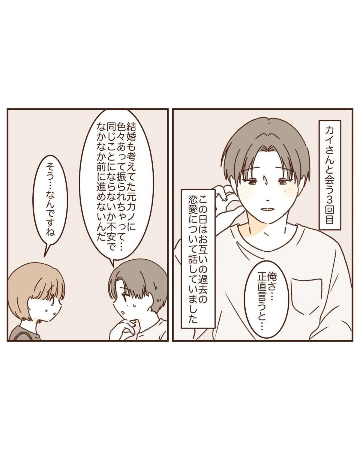 3回目のデートで、くらげさんとカイさんは過去の恋愛について話すことになりました。その会話の中で、二人とも以前付き合っていた相手への気持ちをまだ完全には整理できていないことに気づきます。そこで、今後二人の関係をさらに深めていくかどうかは、しっかり考えてから決めようという結論になりました。