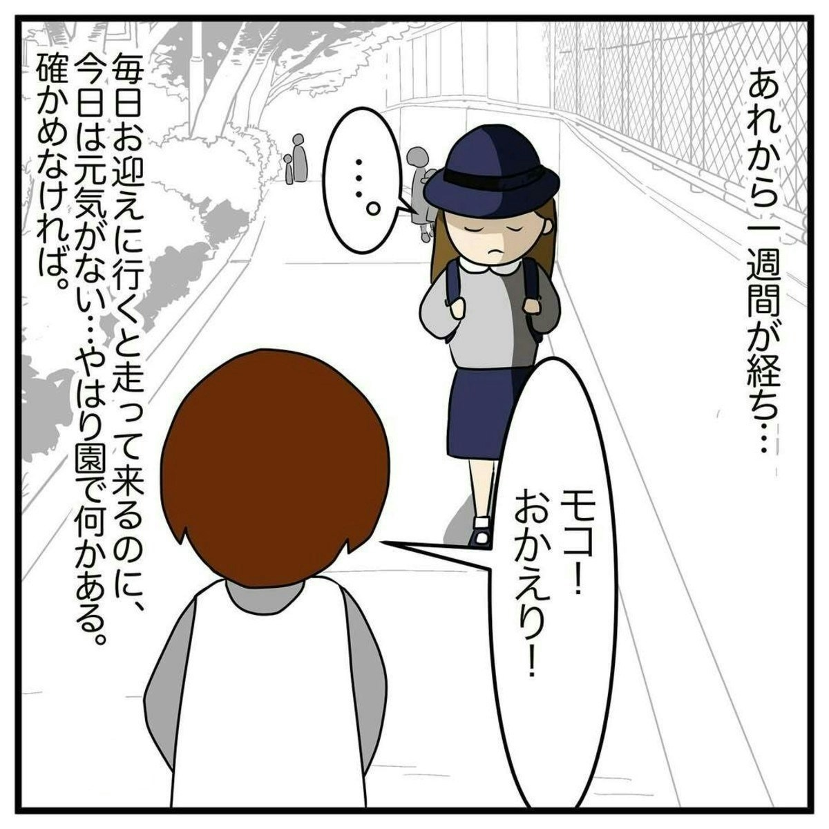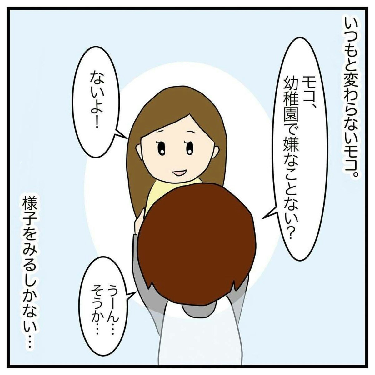 アサコさんは、モコちゃんが持ち帰った上靴を見て、いじめにあっているのではないかと心配になりました。しかし、モコちゃんに幼稚園で嫌なことがなかったか尋ねても、いつもと変わらない様子で答えます。しかしそれから1週間が経つころには、明らかにモコちゃんの元気がなくなっていました。