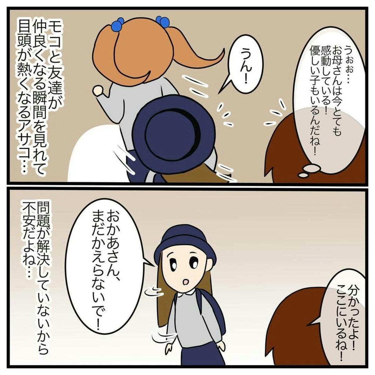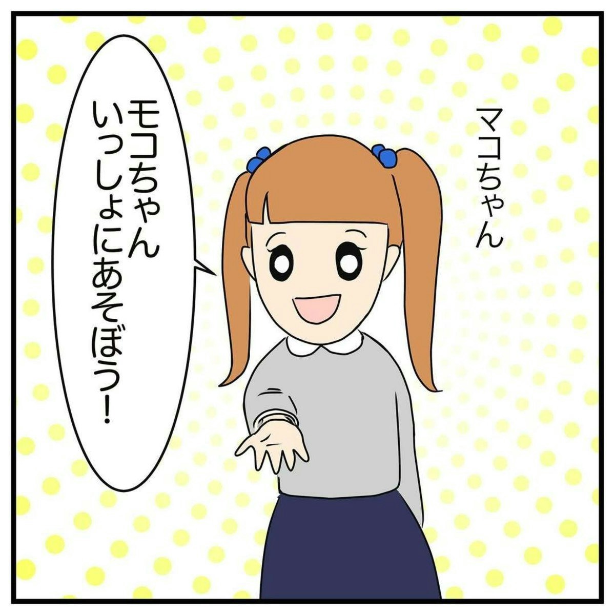 マコちゃんがモコちゃんを遊びに誘ってくれました。娘が友だちと楽しそうに遊ぶ姿を見て、アサコさんは思わず胸が熱くなりました。