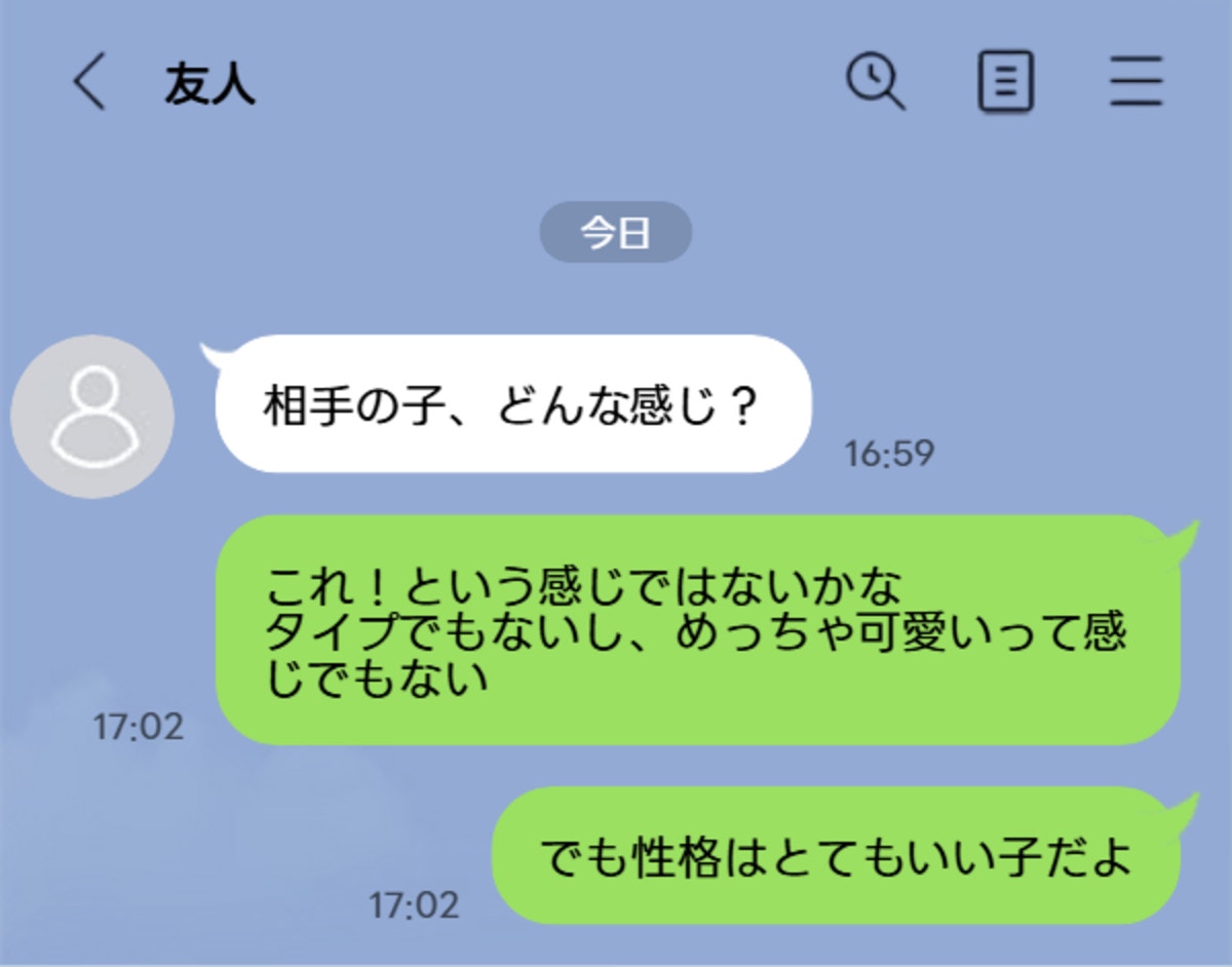 旦那が、これ!と言う感じでタイプでもないし、めっちゃ可愛いという感じではない、でも性格はとても良い子だとラインで送っていました