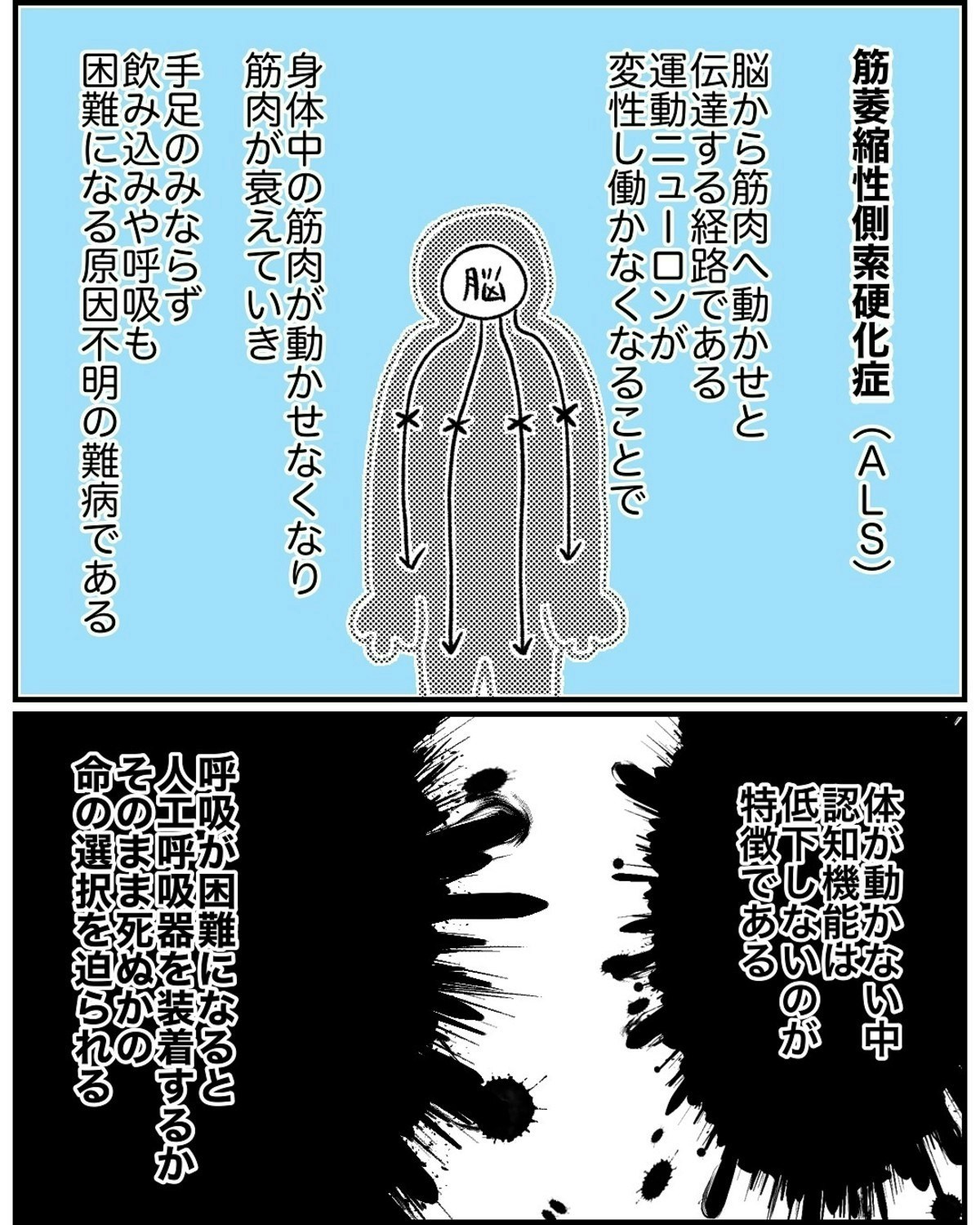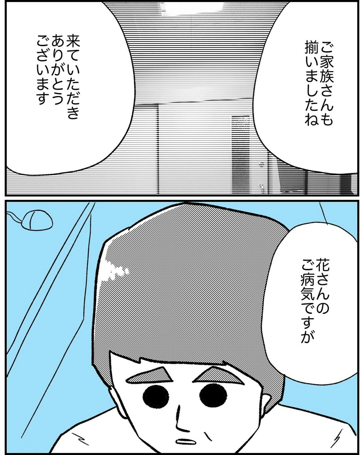 ALSという、難病であることが判明しました。看護師である花さんは、この病気を知っていたため、大きなショックを受けます。
