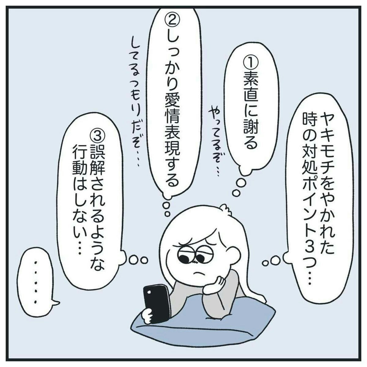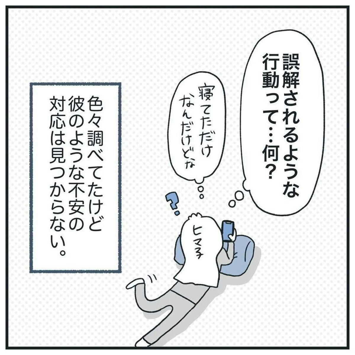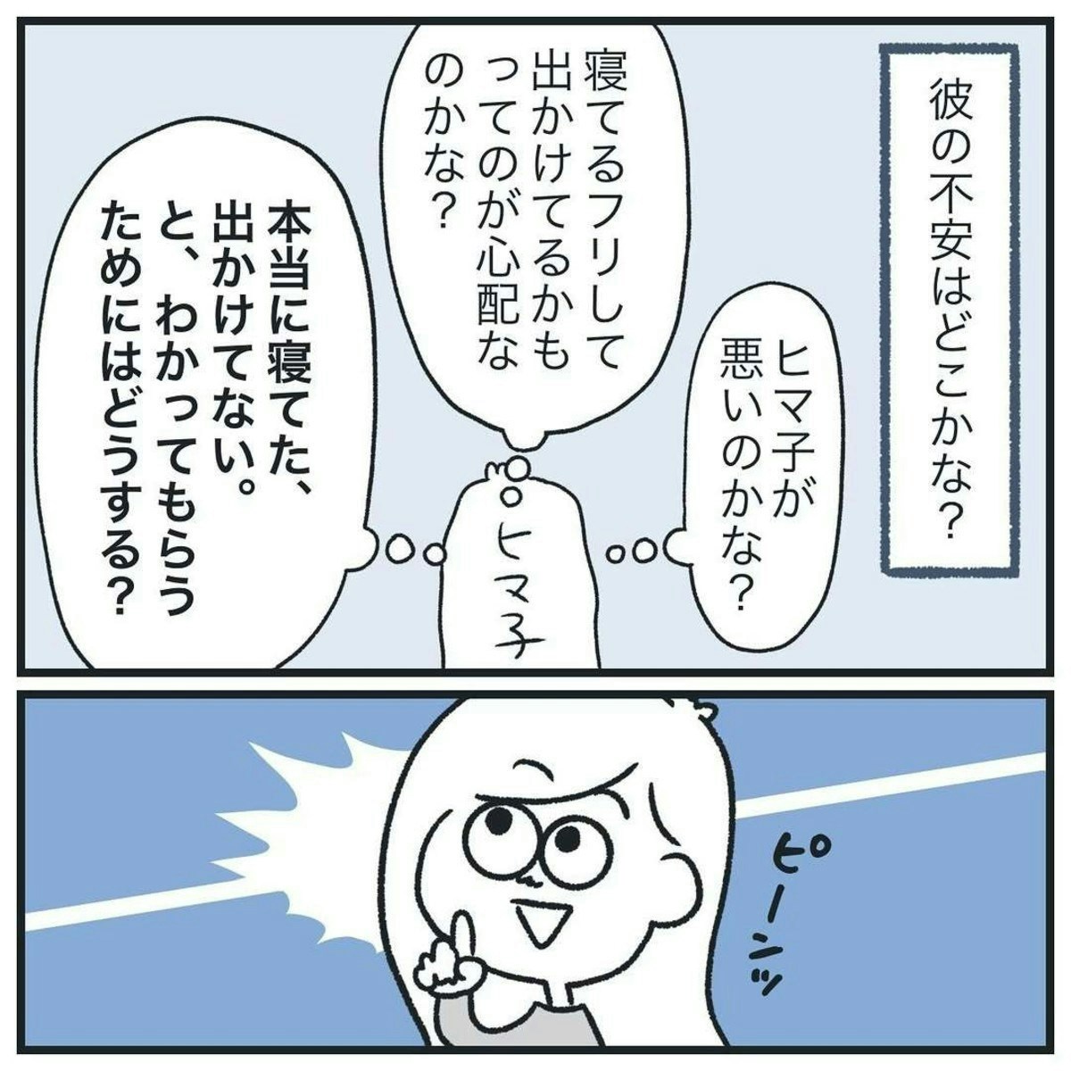 何もやましいことはしていないため、解決策を探るのは難しいですね…。むしろ、彼氏の不安をとりのぞくため、いろいろと調べるヒマ子さん、愛情深いですね。