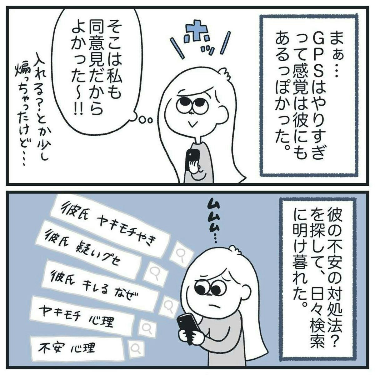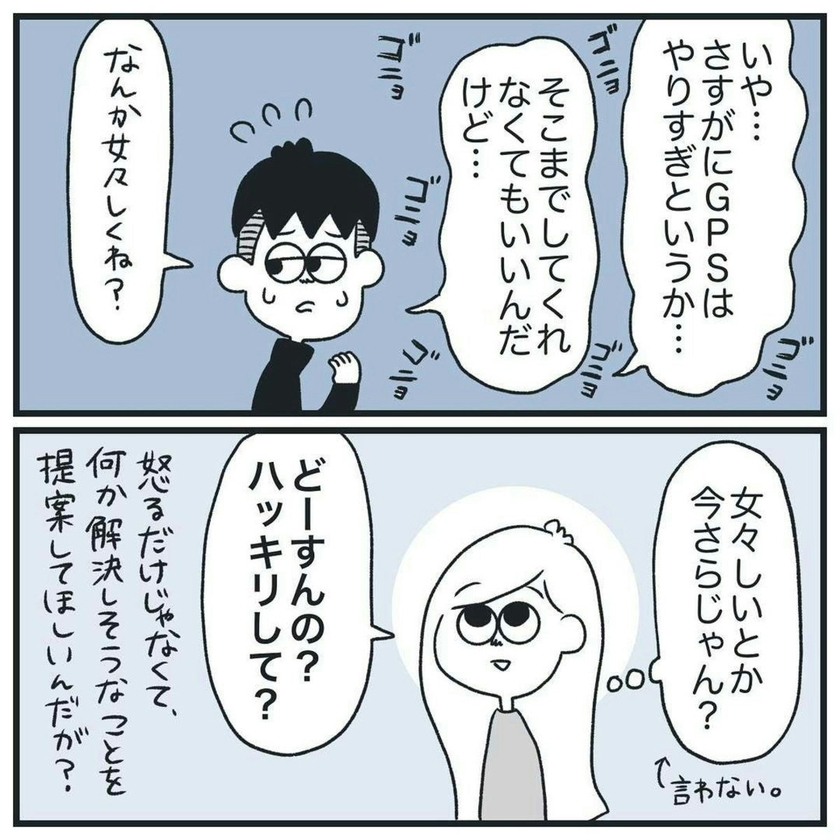 しかしこのあと、再び浮気を疑われてしまいます。そしてついに、GPSを導入することに。ところが、GPSを入れても彼の不安は消えず、むしろ増すばかり…。