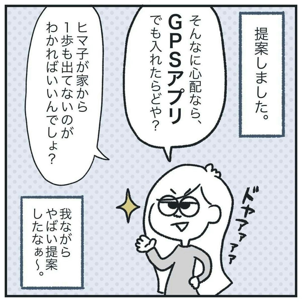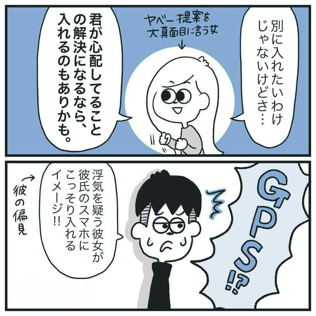 GPSの提案をしました。ヒマ子さんは、真面目に話しつつも、やりすぎだと感じています。それは、彼氏も同意見だったようで、GPSの件は保留に。