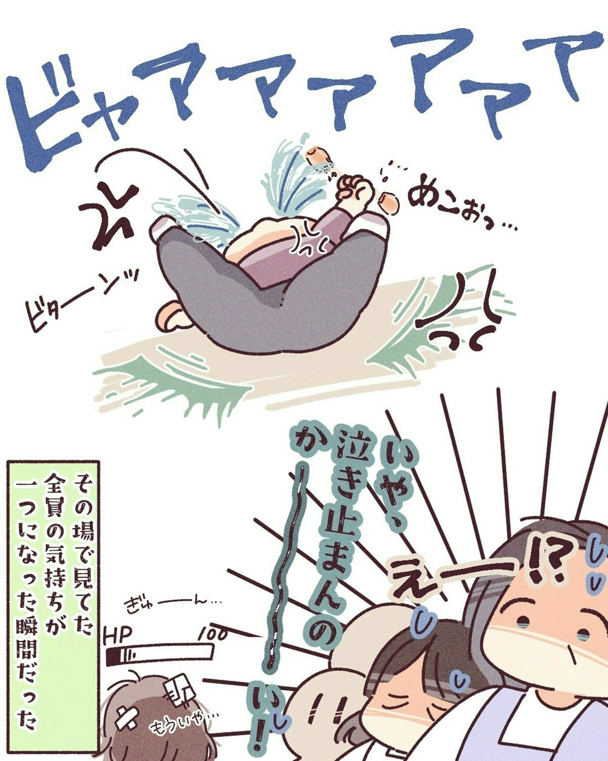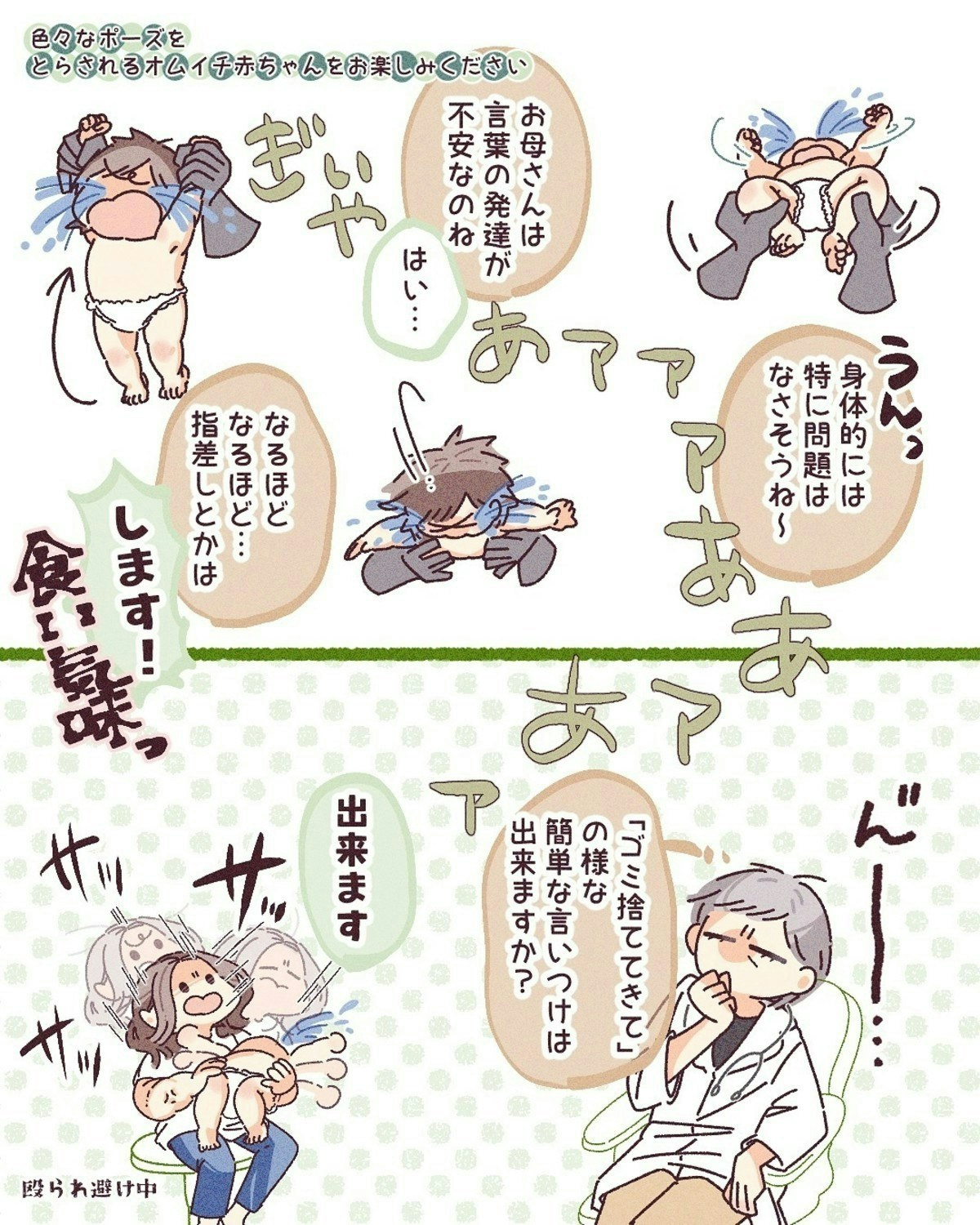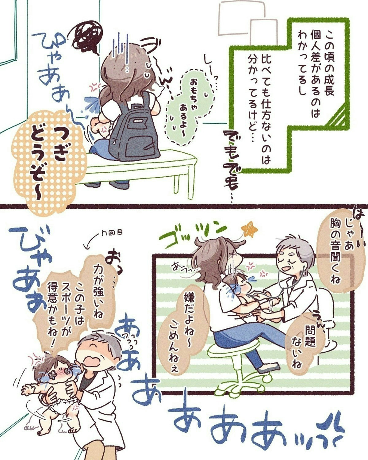 「まわりと比べても仕方ない」と、わかっていても、やはり集団での健診の場では、他の子の様子が目に入るもの。気になってしまう気持ち、理解できますね。子育てに奮闘する親にとって、共感ポイント満載の作品です。