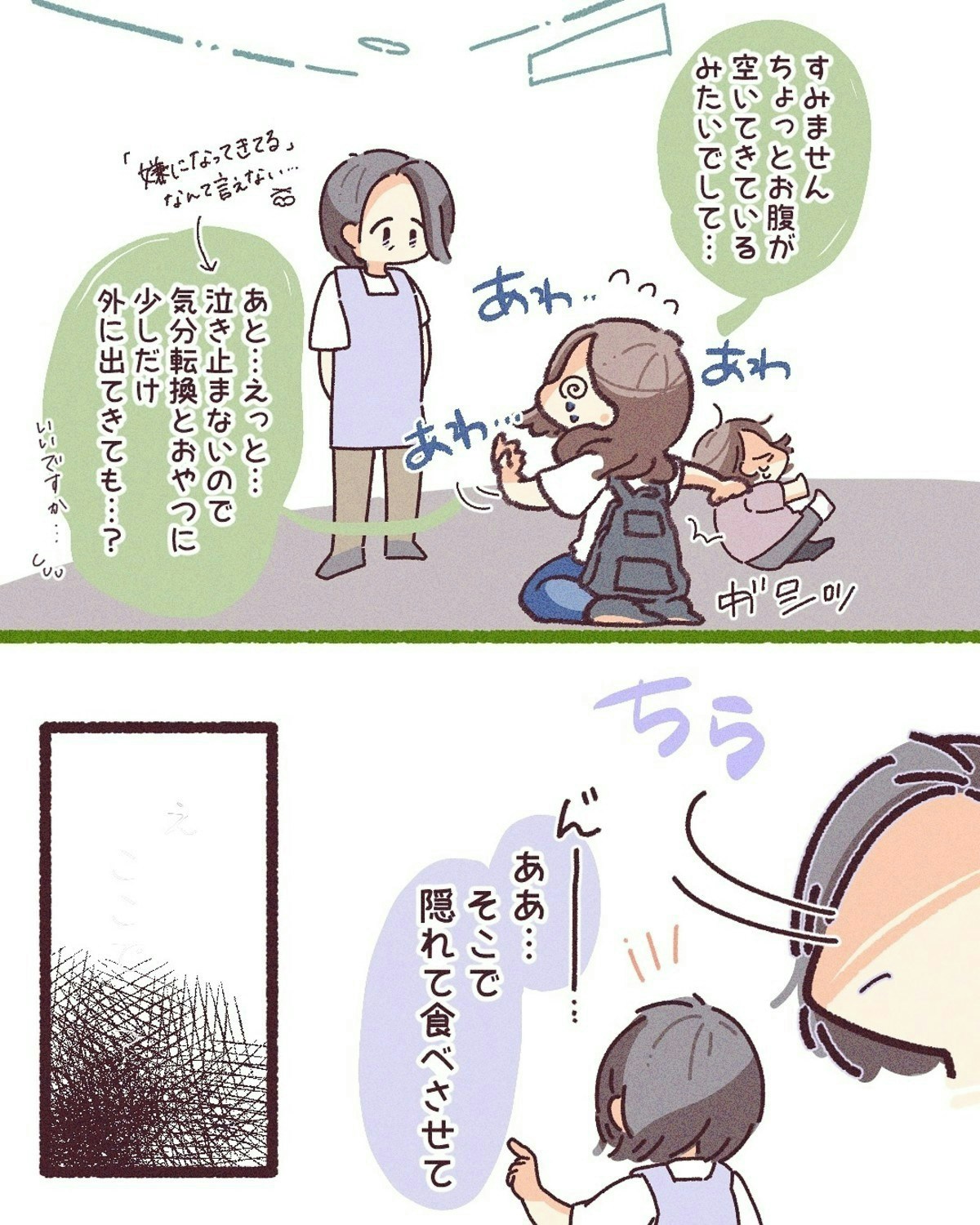 ただ、まわりにも他の子がいる状況の中、食べ物はあげにくいですね。なんとか泣き止ませる方法はないのでしょうか?