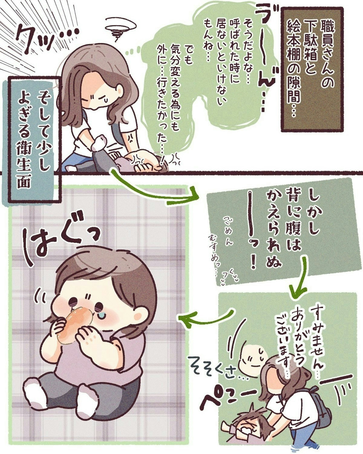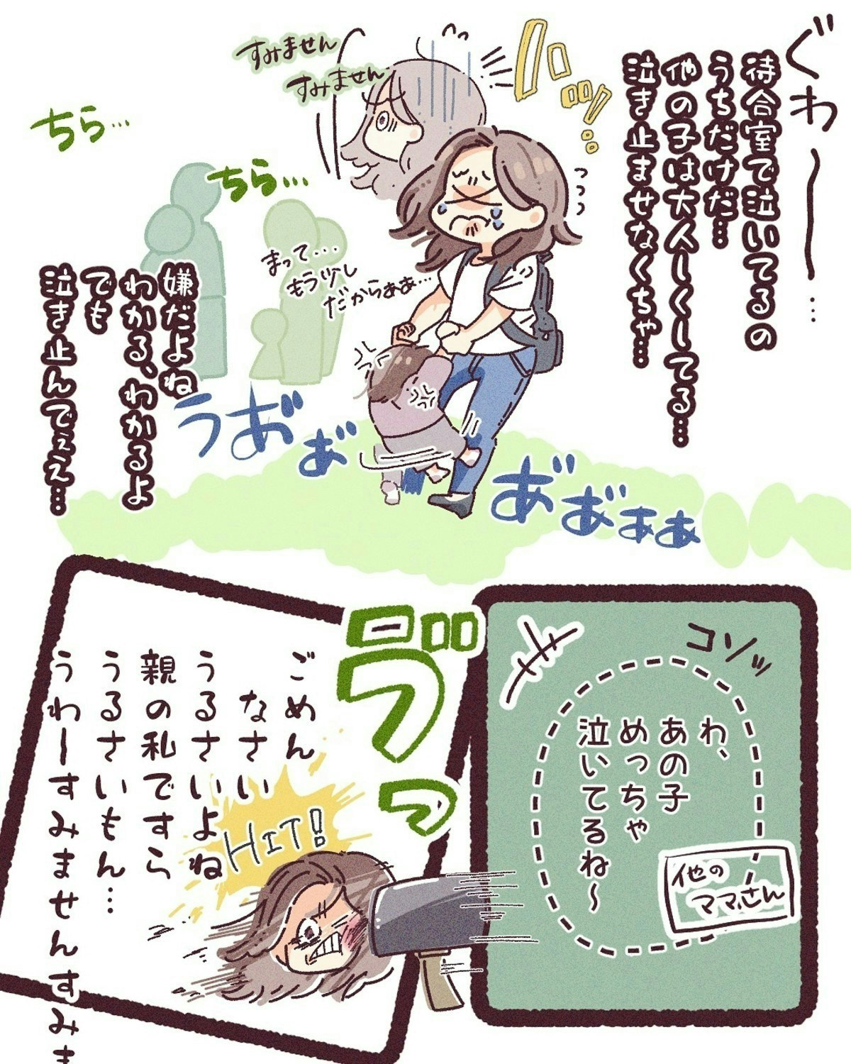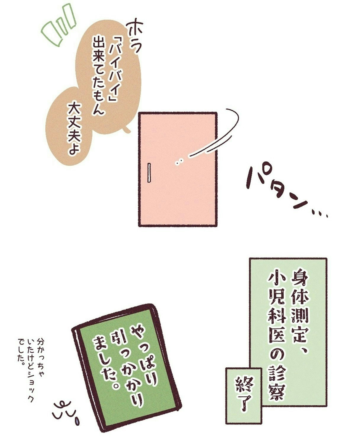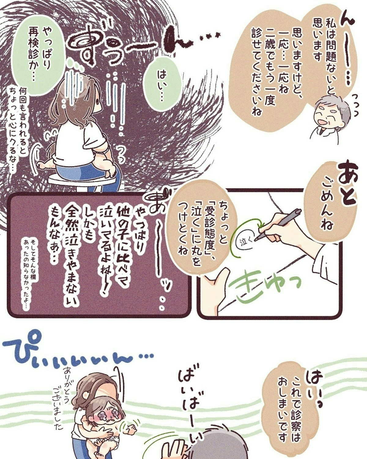 本作では、人見知り・場所見知りが激しい娘の1歳半健診での様子が描かれています。また、2歳での再診を告げられ、ショックを受けます。
