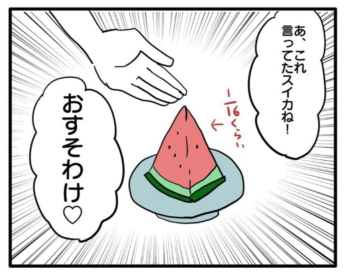 今回、ジロウくんママは1人分サイズくらいのスイカをナナちゃんママに手渡しました。おすそ分けにしては「?」なサイズですよね…。もちろん、分けてくれると言われている手前「これですか?」なんてことは言えませんが、いくら何でもジロウくんママが渡した量は失礼に感じます。