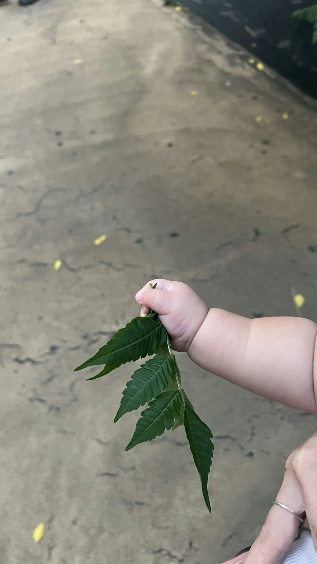 ムチムチとしてかわいい手が葉っぱをギュッと握っている様子を投稿したサメちゃんさん。絶対に離さないぞ!という強い意志を感じるような持ち方で赤ちゃんの表情は見えないものの、満足しているのだろうなと想像できますよね。