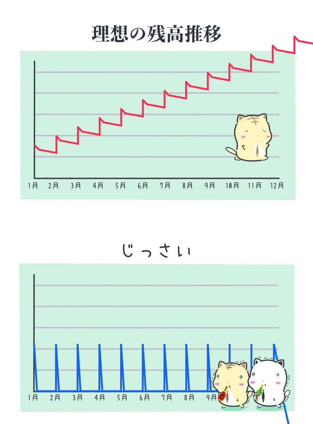 なぽん🐈💨もちねこはサラリーニャン(@MochinecoNapon)さんが投稿していたのは、預金残高の理想と現実。思わず共感してしまう、そのグラフとは?