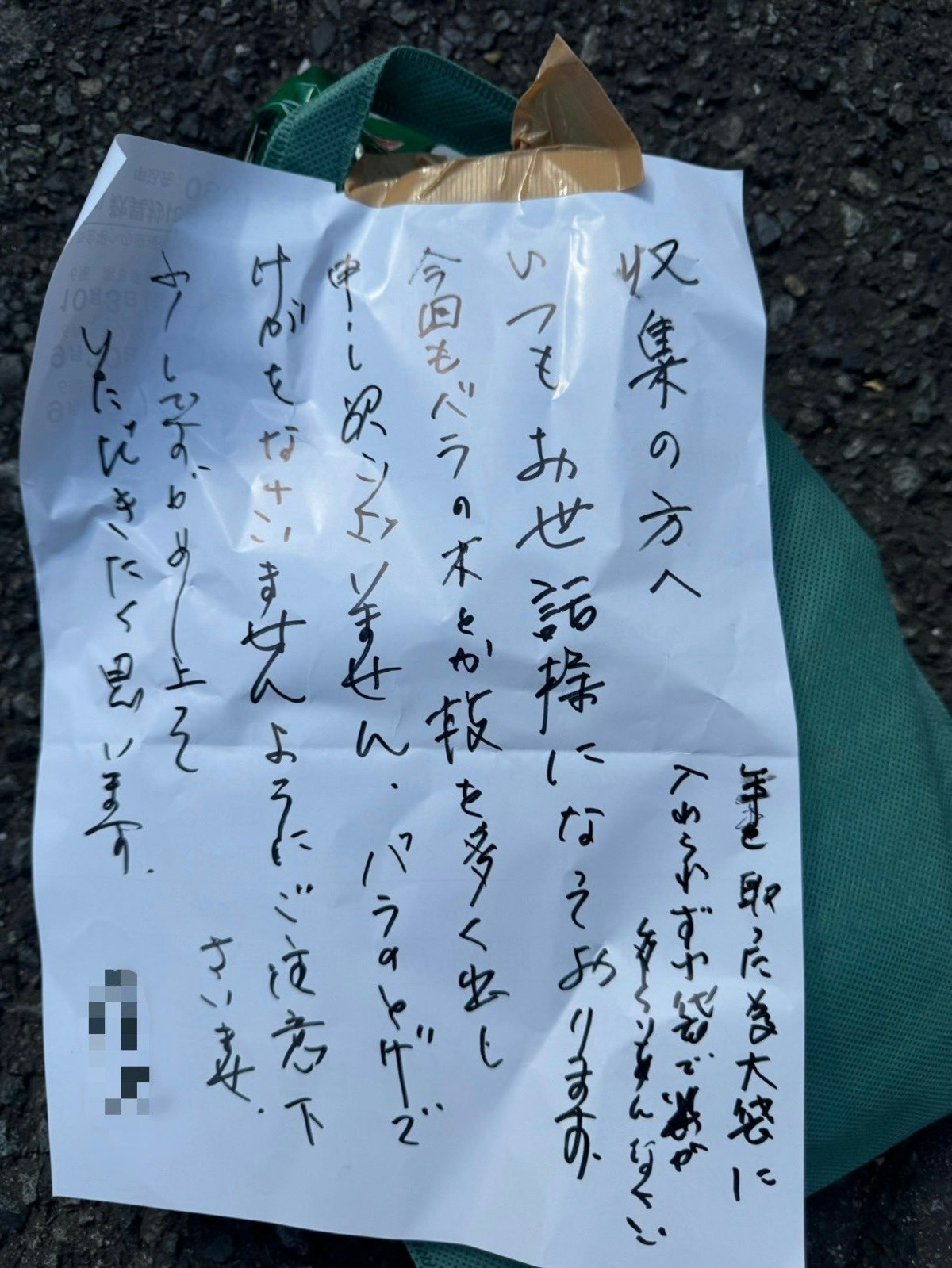 夏は夏みかん、バラ類、ブーゲンビリア等、棘のある植物が多いので、よくトゲに注意という貼り紙をしてくれる方がいて、とても助かります!ごみの山の底に潜んでいると手に刺さることがあるので、わかりやすく置いておいてくれると清掃員は嬉しいです! ※1