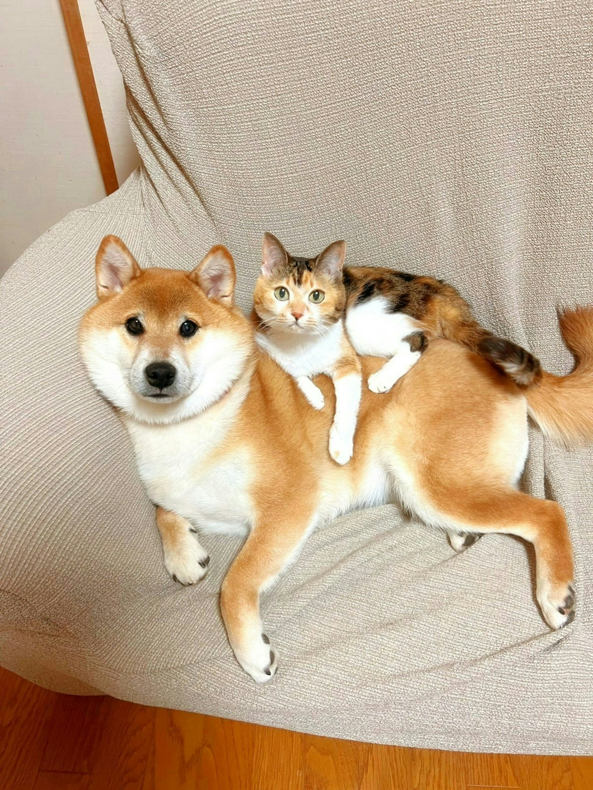 わんちゃんの上にちょこんと座っている猫ちゃん。そして2人してじっとこちらを見ている、なんともかわいらしい写真ですよね。2人の距離が近い姿が見れて、飼い主さんは幸せでしょう。