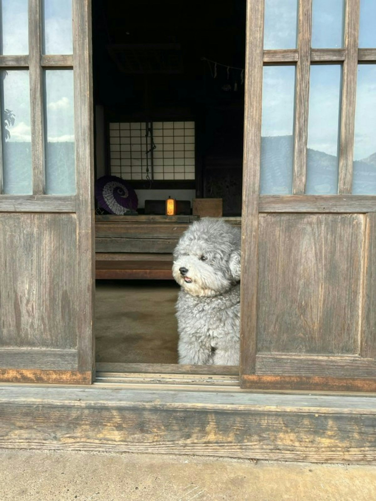 落ち着いた風情のある日本家屋の玄関を開けると、モフモフでかわいいワンコが。こんな光景、最高の癒やしですよね。ギュっと抱きしめたり、ナデナデしたり、モフモフの中に顔をうずめたいという衝動にかられそうです。