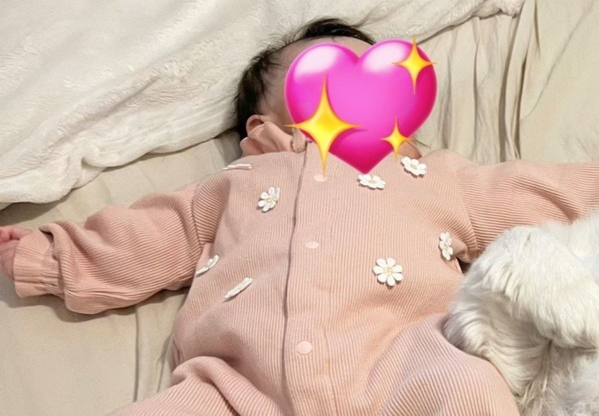愛犬と飼い主は似てくるといいますが、飼い主のお子さんと似てくることもあるようです。☁️ポリコ☁️さんは、赤ちゃんがベッドでスヤスヤ寝ていると思ったら、なんとその隣には愛犬の驚くべき姿が…。それがこちらです。