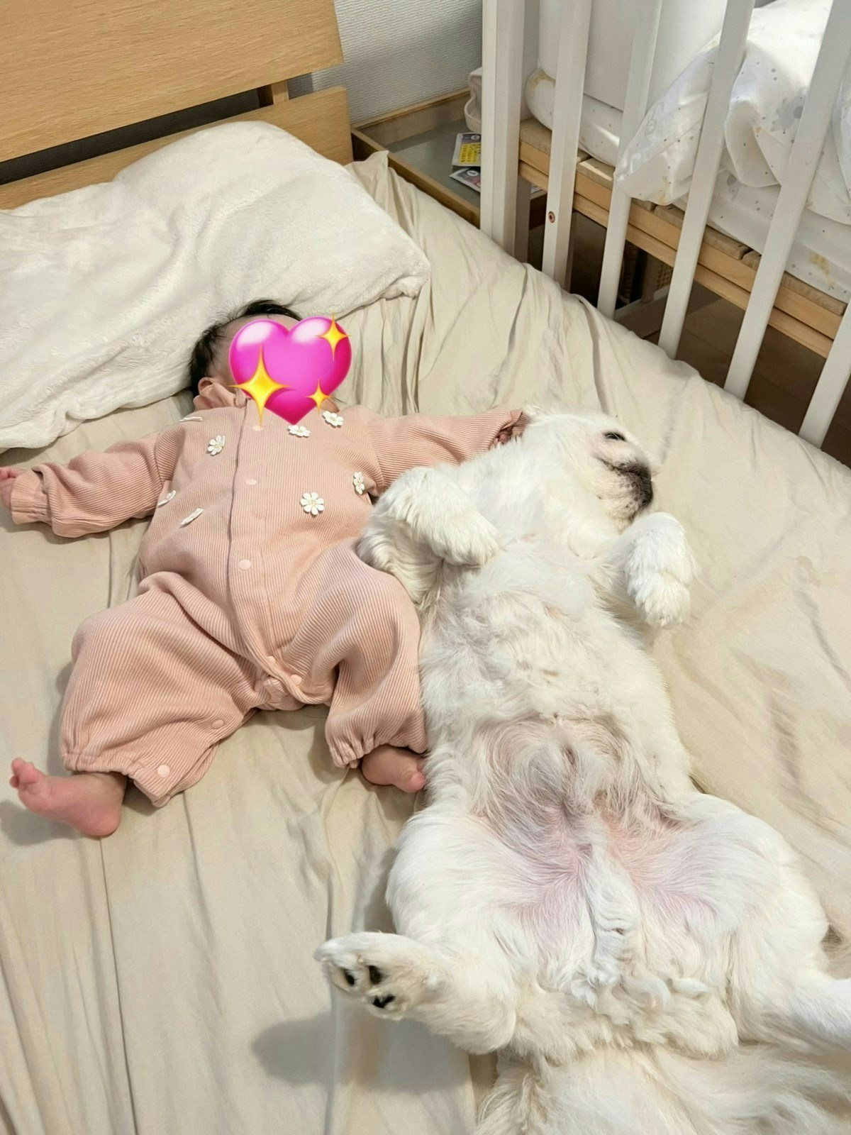 小さな手・足を気持ちよさそうに広げて寝ている赤ちゃんの隣に、同じ寝相で横になっている愛犬。とってもキュートですね。「おなかなでて~」と言っていそうです。この投稿には「可愛い双子ですね」「ほっこりしました」といったリプライがついていました。