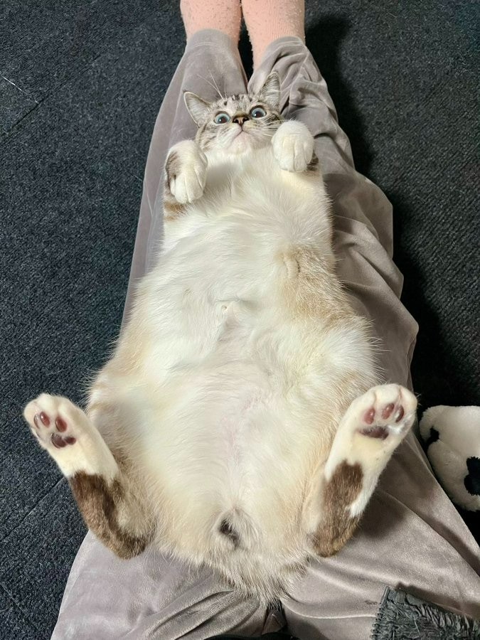 膝の上でへそ天しているちくわくん。やくまろさんが見下ろす形で撮影をしていますが、あまりのちくわくんの眼力にこちらが見下ろされているような気になりますね。黒目がぎょろりと下を向き、口元がへの字に見えるため迫力があります…。とはいえフワフワなおなかの毛に、撫でまわしたくなってしまいます!