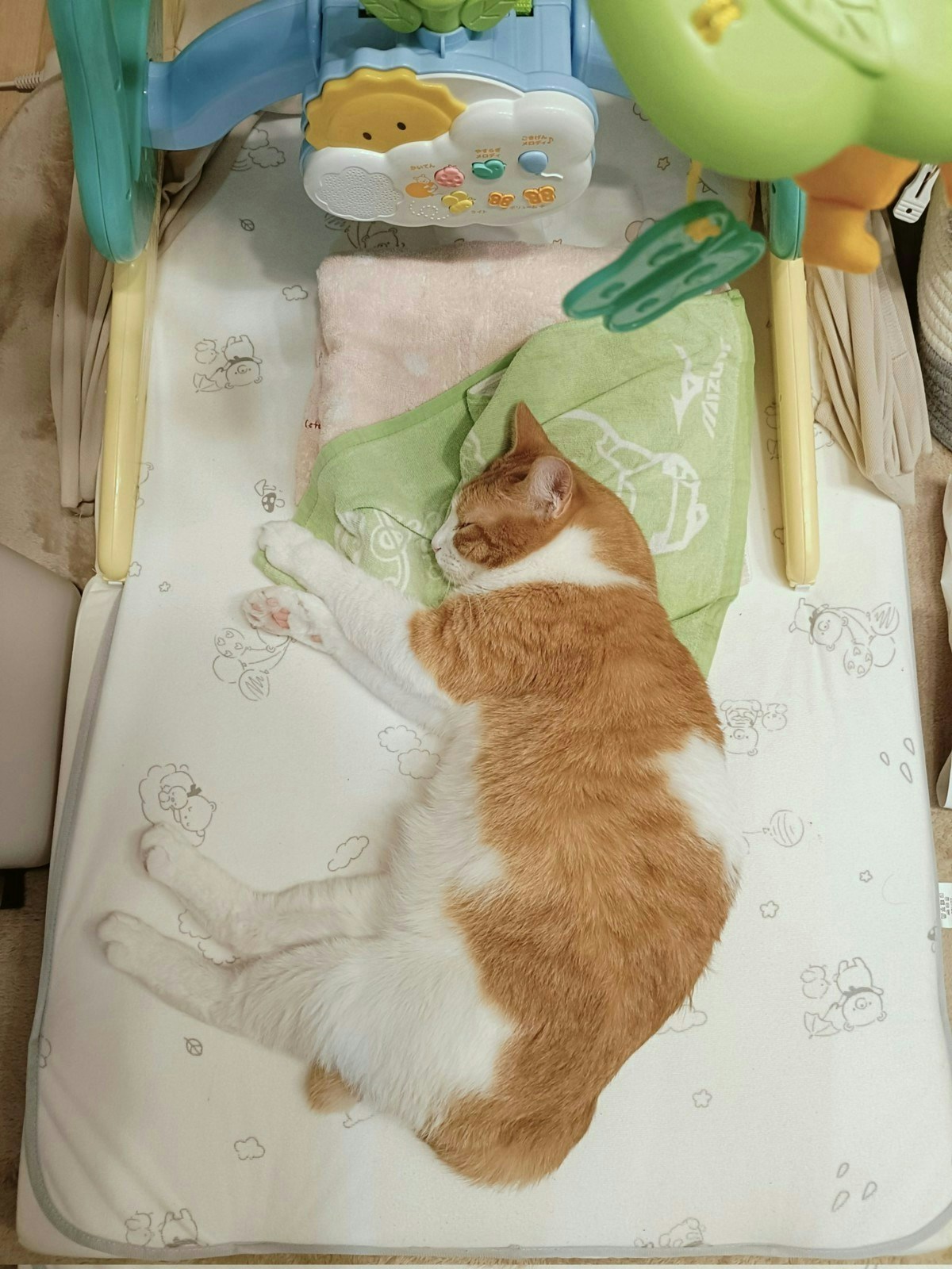 しっかりと枕に頭を乗せている猫ちゃん。リラックスしつつも、赤ちゃんの居場所を守っているようにも見えます。帰ってくるまでの間、ちょっとだけ…と思っていたら寝てしまったのでしょうか。赤ちゃんと猫ちゃんの関係性が分かるような、素敵な1枚です。