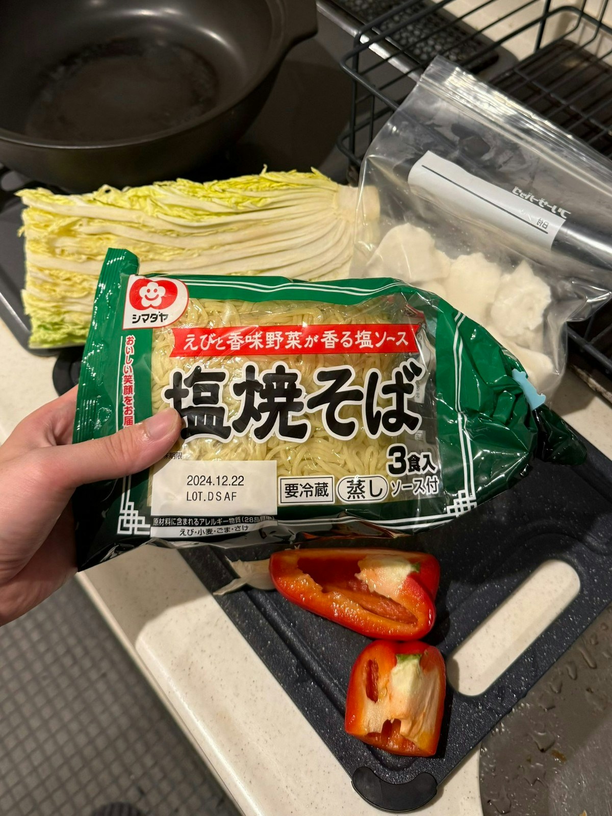 穴井メルさんは塩焼きそば麺を使って塩ラーメンを作っていました。穴井メルさんが使った焼きそば麺の場合ソース付きで、溶かすだけでスープができるのが時短となっていいですね。