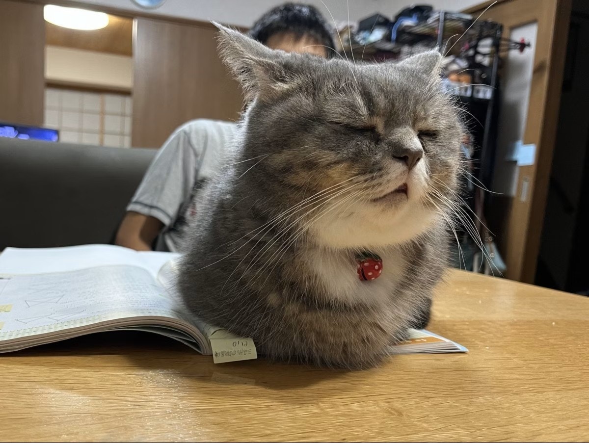 本の上にのっしり…堂々とした「ネコハラ」に3万いいね