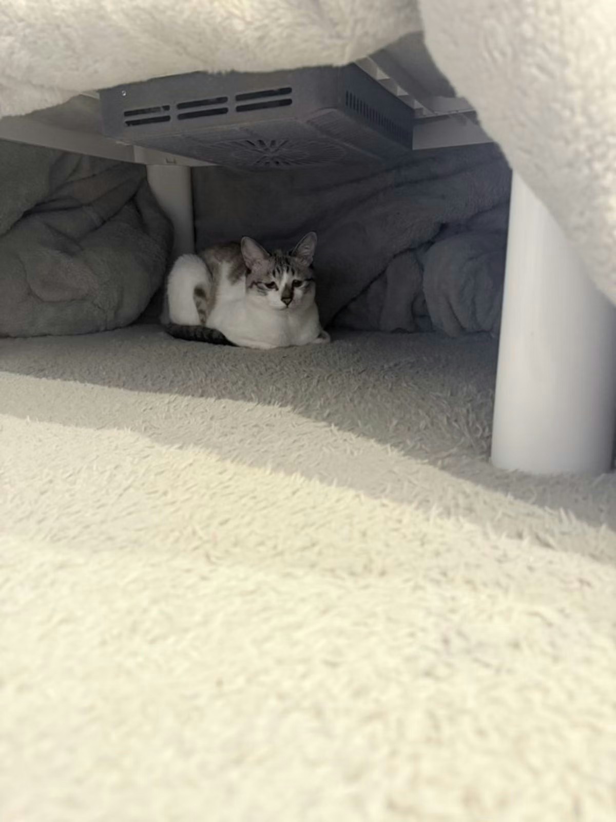 投稿者・ぴえん猫ミントさんの愛猫・ミントちゃんも、こたつが大好き。こたつ登場を見るやいなや、さっそく中へと潜り込んだのだそう。しかし、こたつ内のミントちゃんはどこか切ない表情で…。