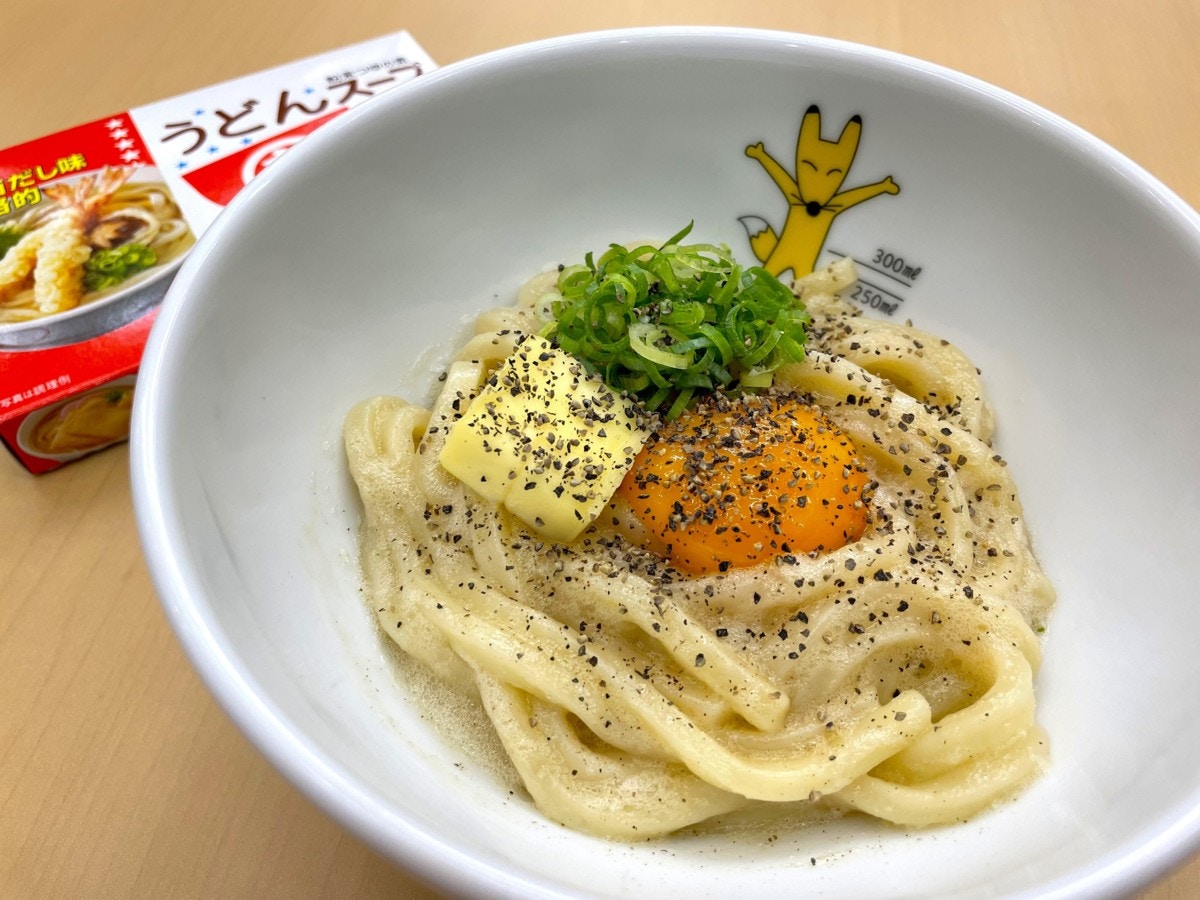 レンチンした冷凍うどんに、うどんスープ1/2袋をふりかけて混ぜ、生卵・バター・粗びき黒コショウ、お好みでネギや天かすをのせたら完成!