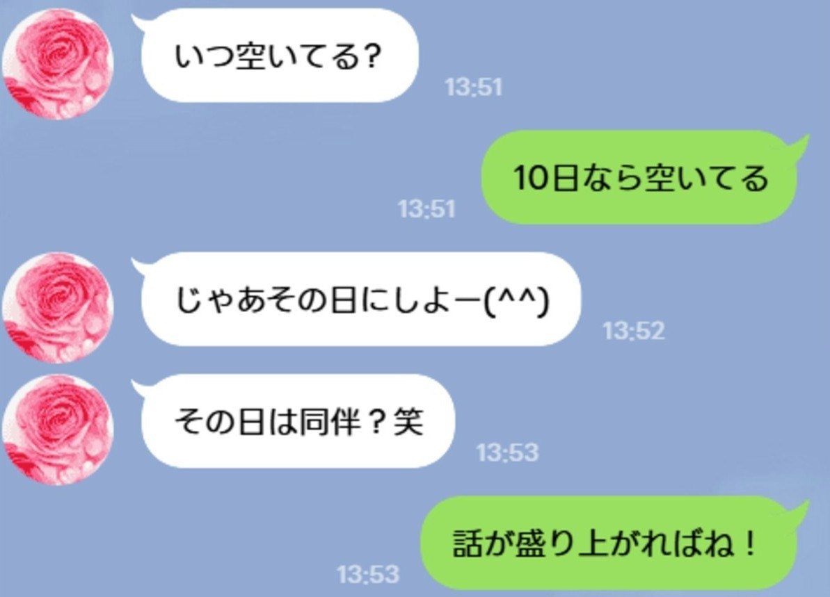 そんなにすごく仲が良いというわけじゃない関係と思っていたのですが、トーク画面を開いてみると、女性の方から「いつ空いてる?」と話が始まっていました。