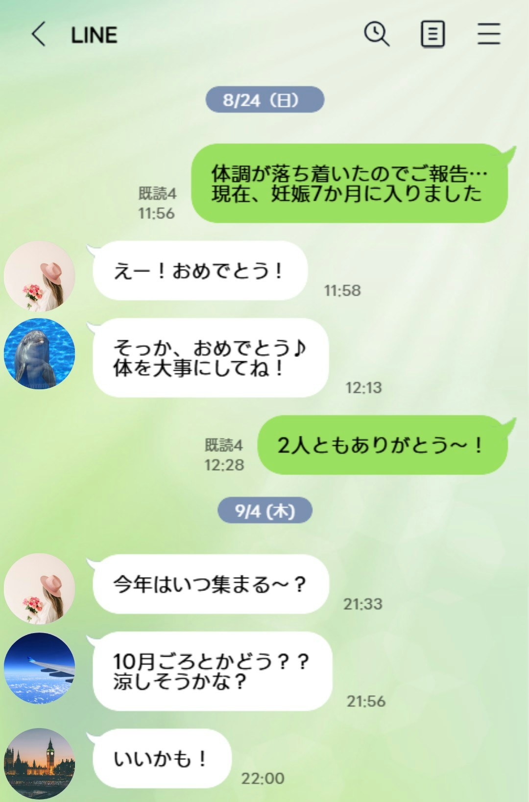 結婚3年目で子供を授かり妊娠7ヶ月となったので前職の同期5人(自分含む)のグループラインで妊娠報告しました。