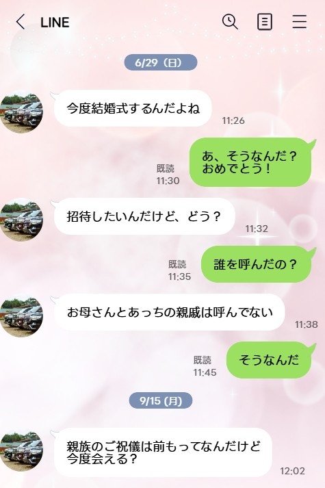 と春ごろLINEが来ており、そこから連絡取ってなかったのですが、9月末に式なのでそろそろ来るかなと思ったら案の定数日前に「会える?」と連絡が来ました。