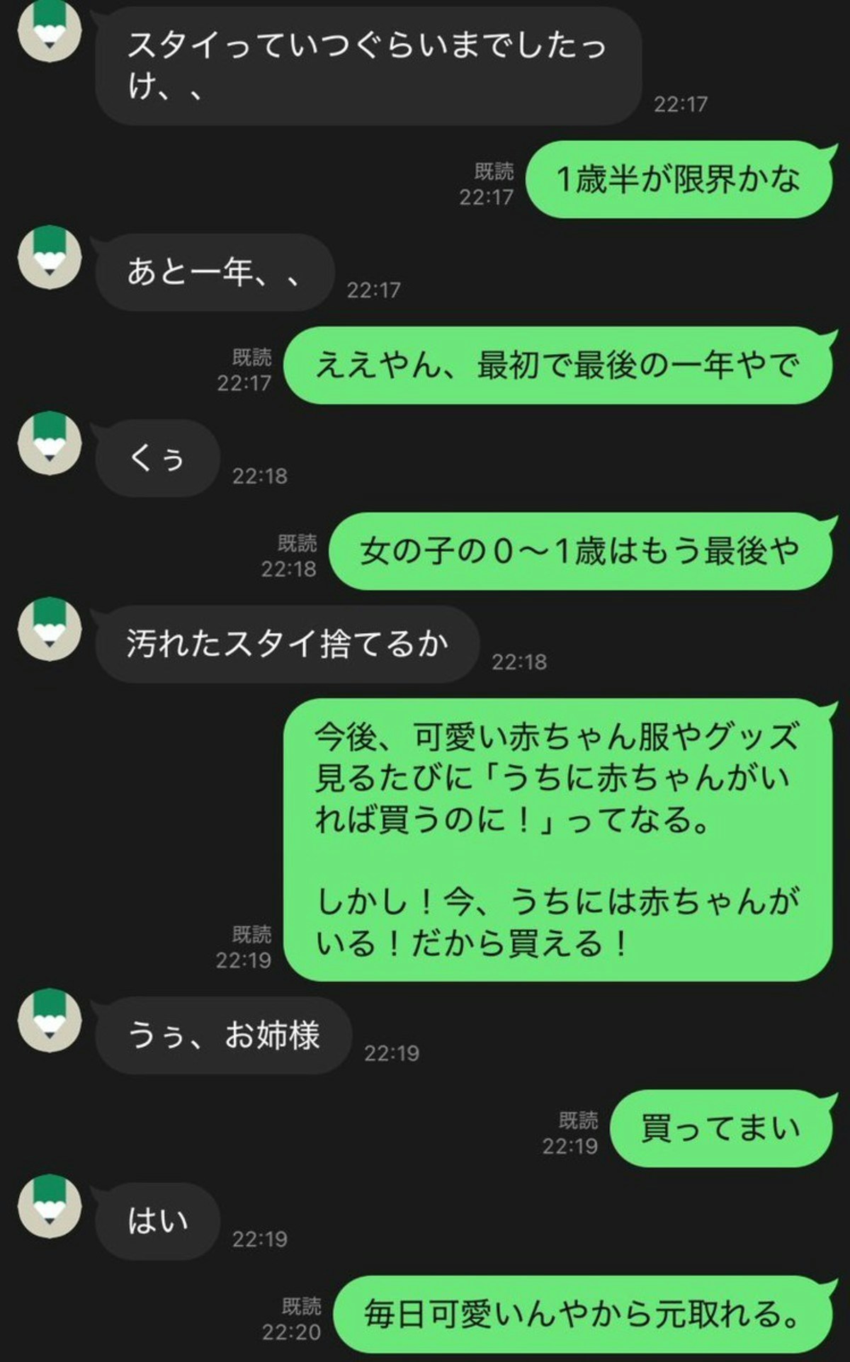 コニースタイはとても可愛らしくデザインも豊富なことから、十分な数のスタイを持っていたとしても欲しくなってしまいますね。スタイを使うのはあと1年だし…と悩む妹さんに「最初で最後の1年」「今、うちには赤ちゃんがいる!だから買える!」「毎日かわいいんやから元取れる」と次々と後押しをかけるユニかばさん。